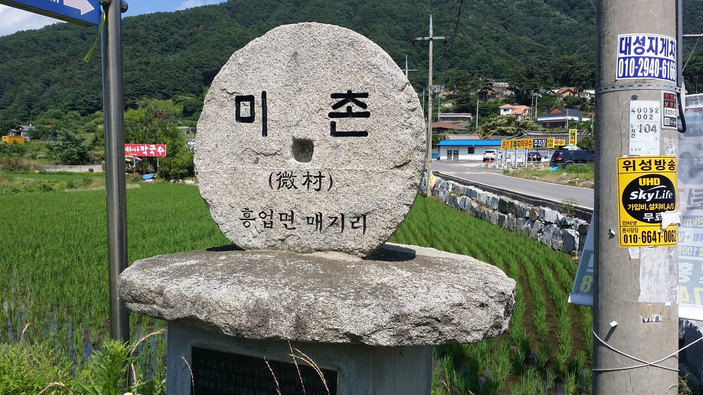 14:42 미촌 표지석-인도가 구분된 2차로 따라.