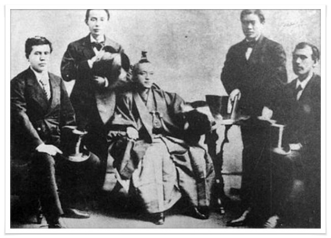 이와쿠라 사절단. 오른쪽부터 오쿠보 도시미치, 이토 히로부미, 이와쿠라 도모미, 야마구치 나오요시, 기도 다카요시