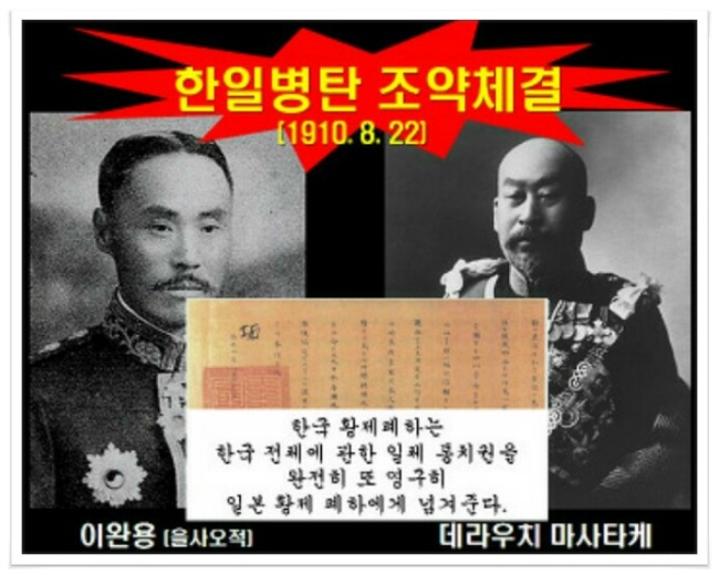 1910년 8월 22일 매국노 이완용과 일본의 데라우치 마사다케가 한일병탄 조약체결을 했다.