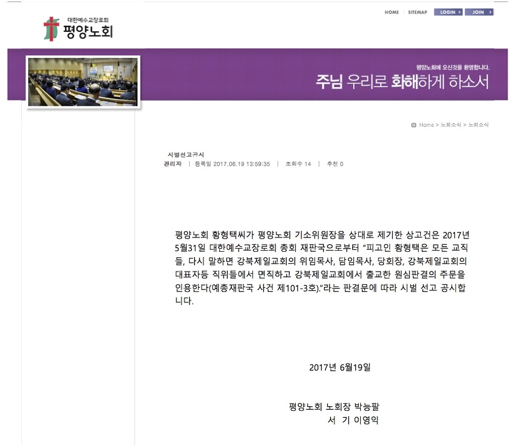 평양노회 황형택씨가 평양노회 기소위원장을 상대로 제기한 상고건은 2017년 5월 31일 대한예수교장로회 총회 재판국으로부터 "피고인 황형택은 모든 교직들, 다시 말하면 강북제일교회 위임목사, 담임목사, 당회장, 강북제일교회의 대표자등 직위들에서 면직하고 강북제일교회에서 출교한 원심판결의 주문을 인용한다(예총재판국 사건 제101-3호)." 라는 편결문에 따라 시벌 선고 공시합니다.