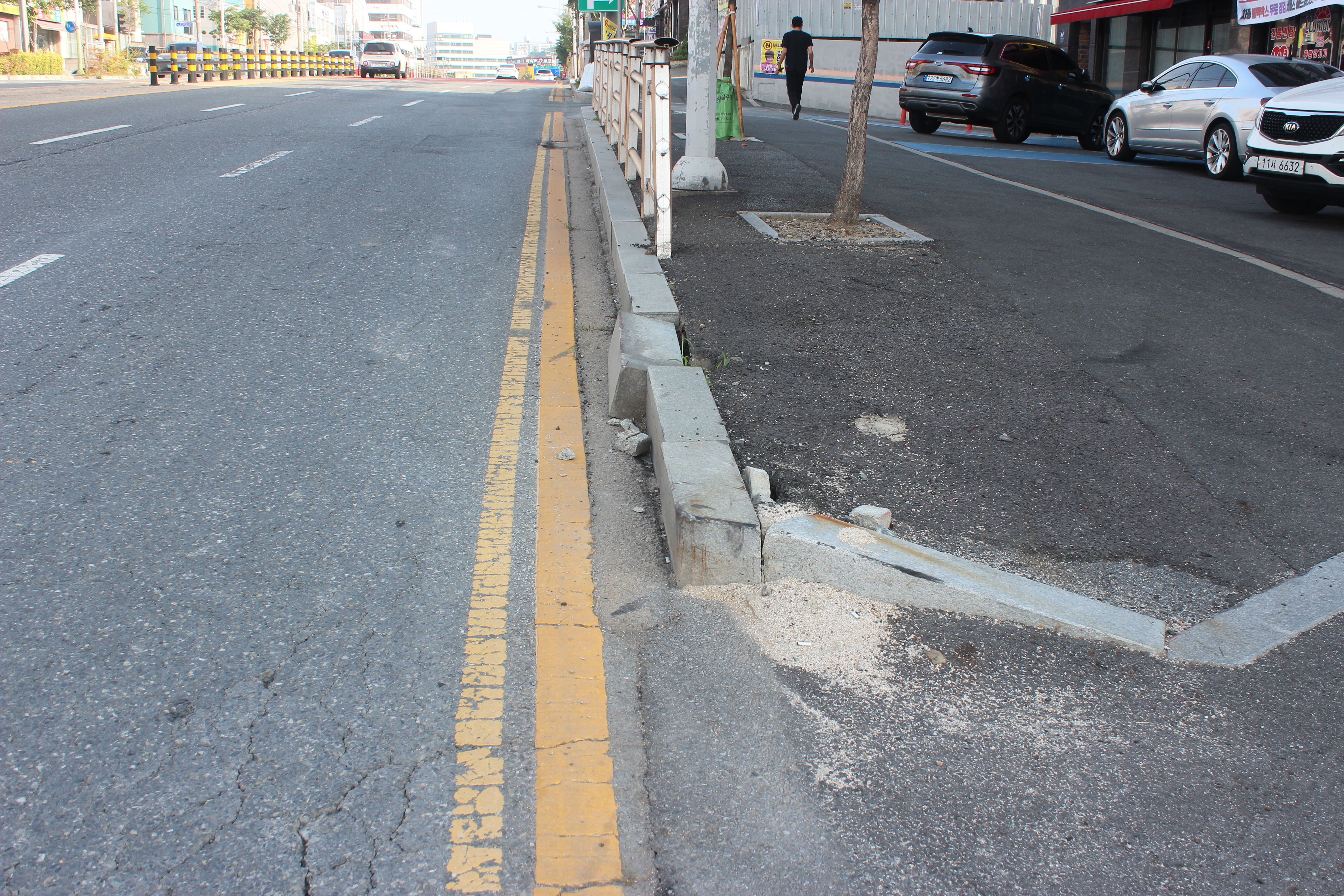 차보도경계석이 파손되어 도로측구(道路側溝)로 밀려났고 진입로와 접한 곳에 경사경계석 또는 둥근 경계석을 설치하지 않아서 교통안전에 문제가 발생했고 피해를 보는 차량들이 있는데도 개선되지 않고 있는 현장으로써 공사를 하시는 전문가들이 몰라서 그런 것도 아닐 것인데 왜? 저렇게 만들었는지 의문입니다. 조심스럽게 조언(助言)을 드리면 보도노면과 시설물(施設物)이 빈번하게 파손되는 것을 방지(防止)하고 교통안전과 불특정다수인 시민들의 안전을 위해서는 관리주체의 역할이 중요합니다.