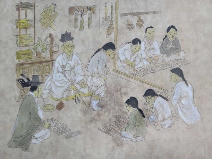 옛날 오래전에 그려진 그림입니다 그림 자체가 아주 재미있습니다 서당에 공부를 하는 서생들과 훈장님이 잘못한 아이를 종아리를 회초리로 때리고 있습니다