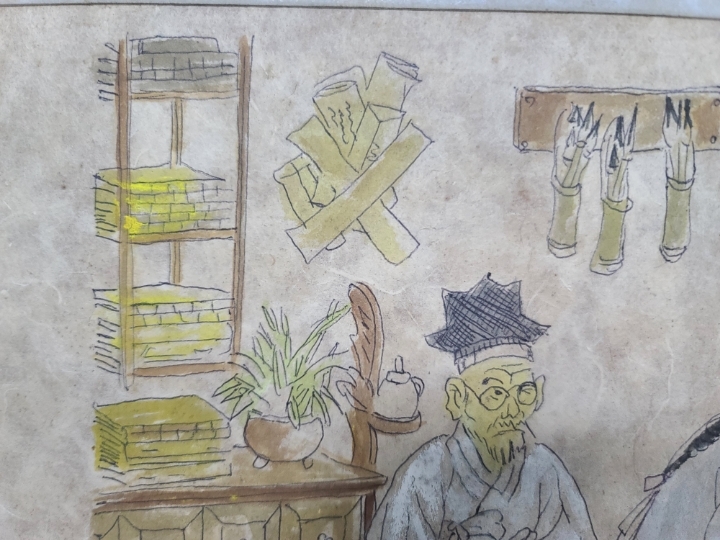 그것을 보면서 킥킥거리고 웃는 아이이도 있고 그나마의 공부를 하는 척 하는 아이들도 있습니다 장식장에 놓인 옛날 책과 문방사우 화병 유등 빗자루 그리고 갓을 쓴 선비의 모습이 전체적으로 구도가 좋고 재미있게 잘 그려진 그림입니다