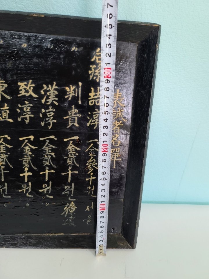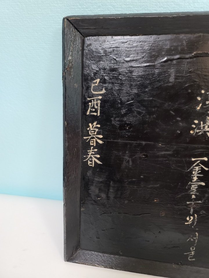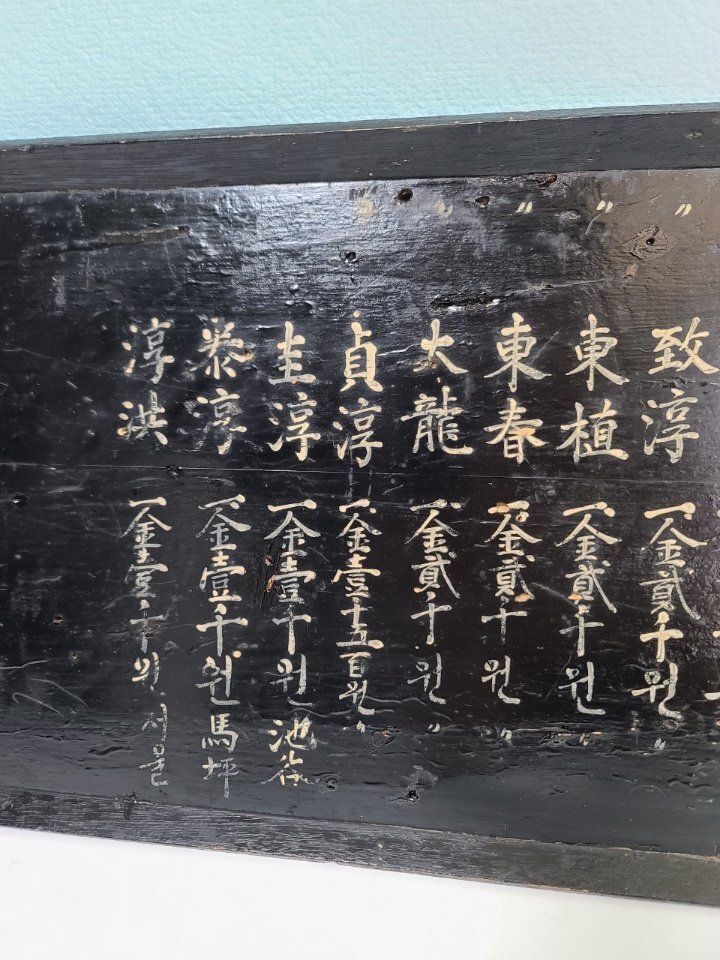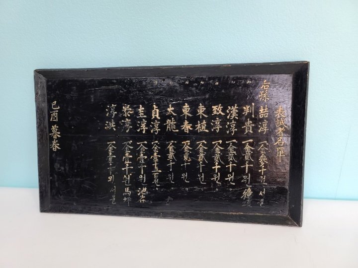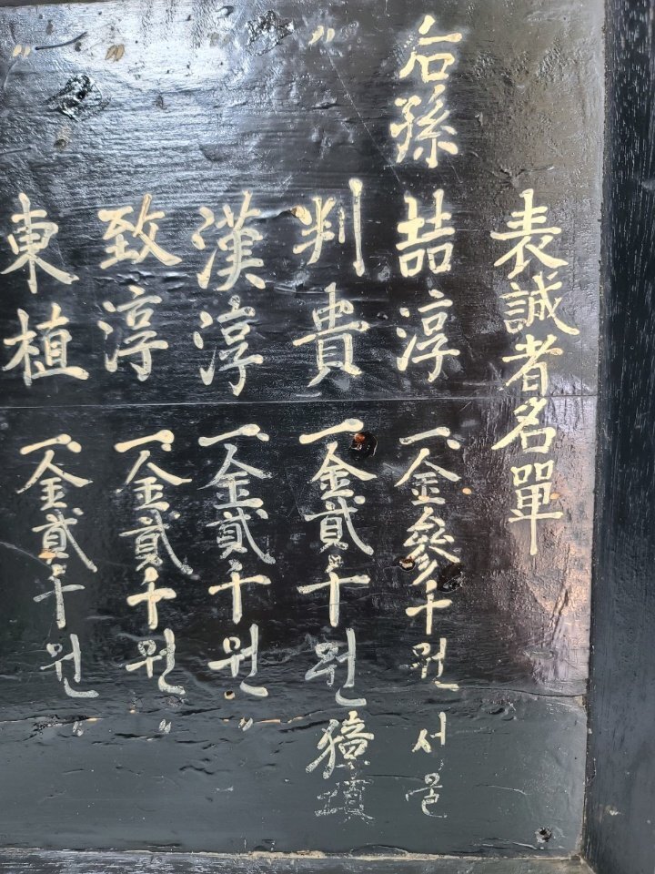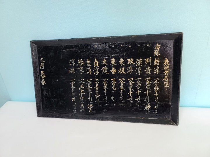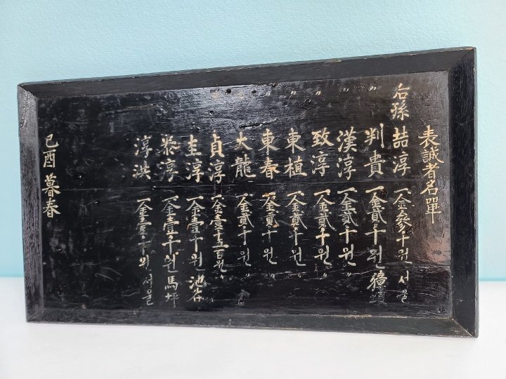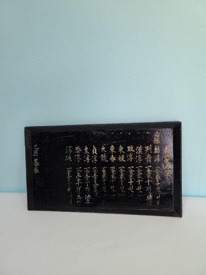 옛날 오래 전에 만들어진 상량각이며 서원 건축 납부 명단이라고 합니다ㆍ 조선시대 구한말 일제 강점기 정도 만들어진 것으로 보이며 모반 형식으로 잘 만들어졌습니다 전체적으로 나무를 깎아서 그 위에 옻칠을 하였습니다 그리고 돈을 낸 사람들의 명단 이름 적혀 있습니다