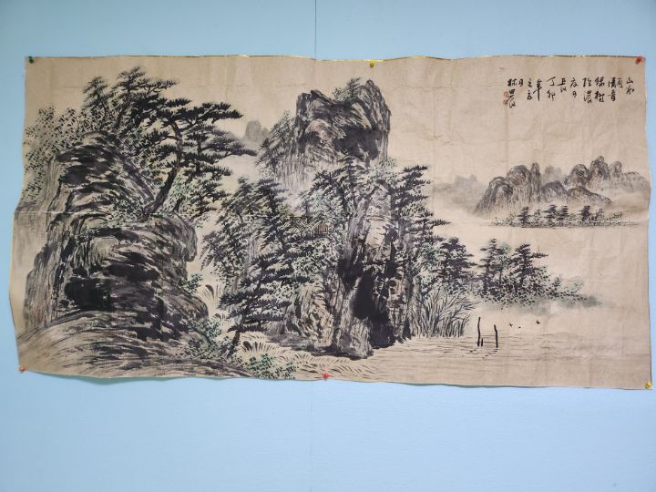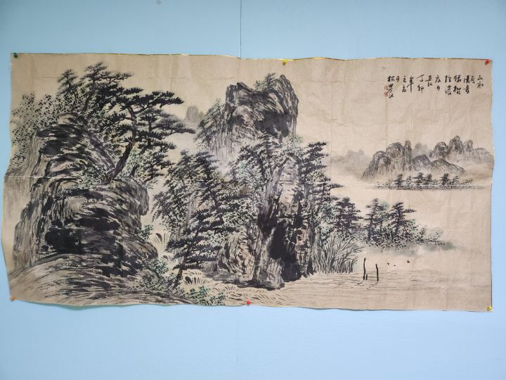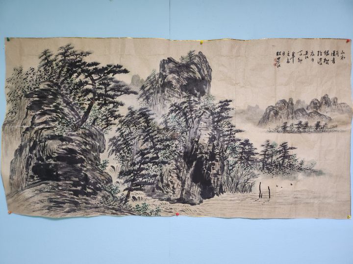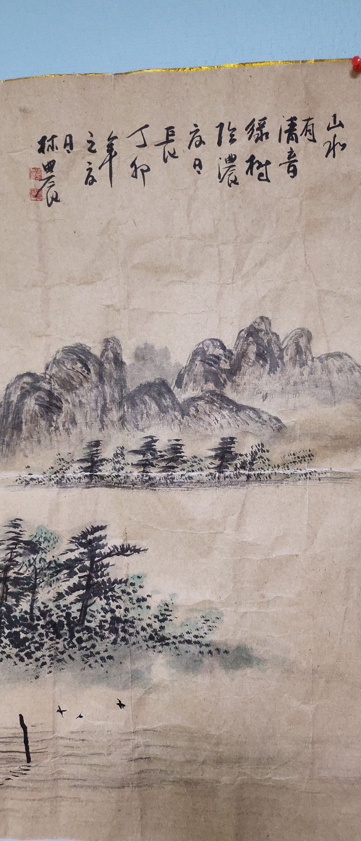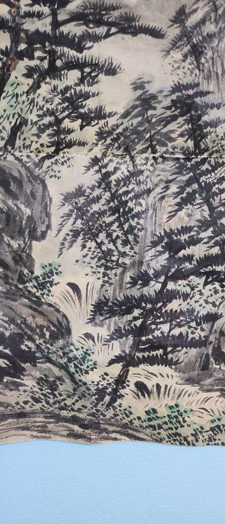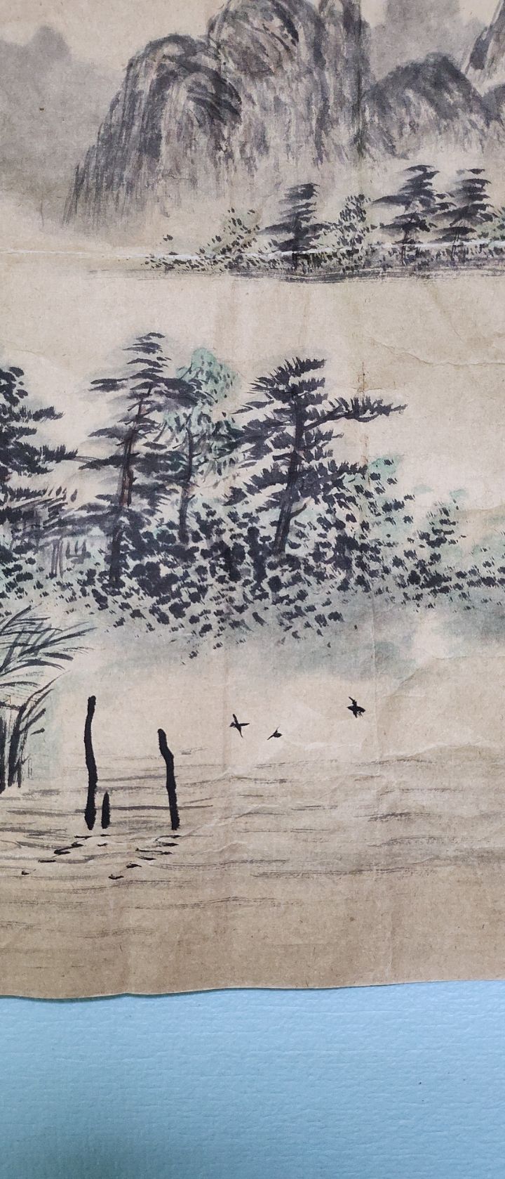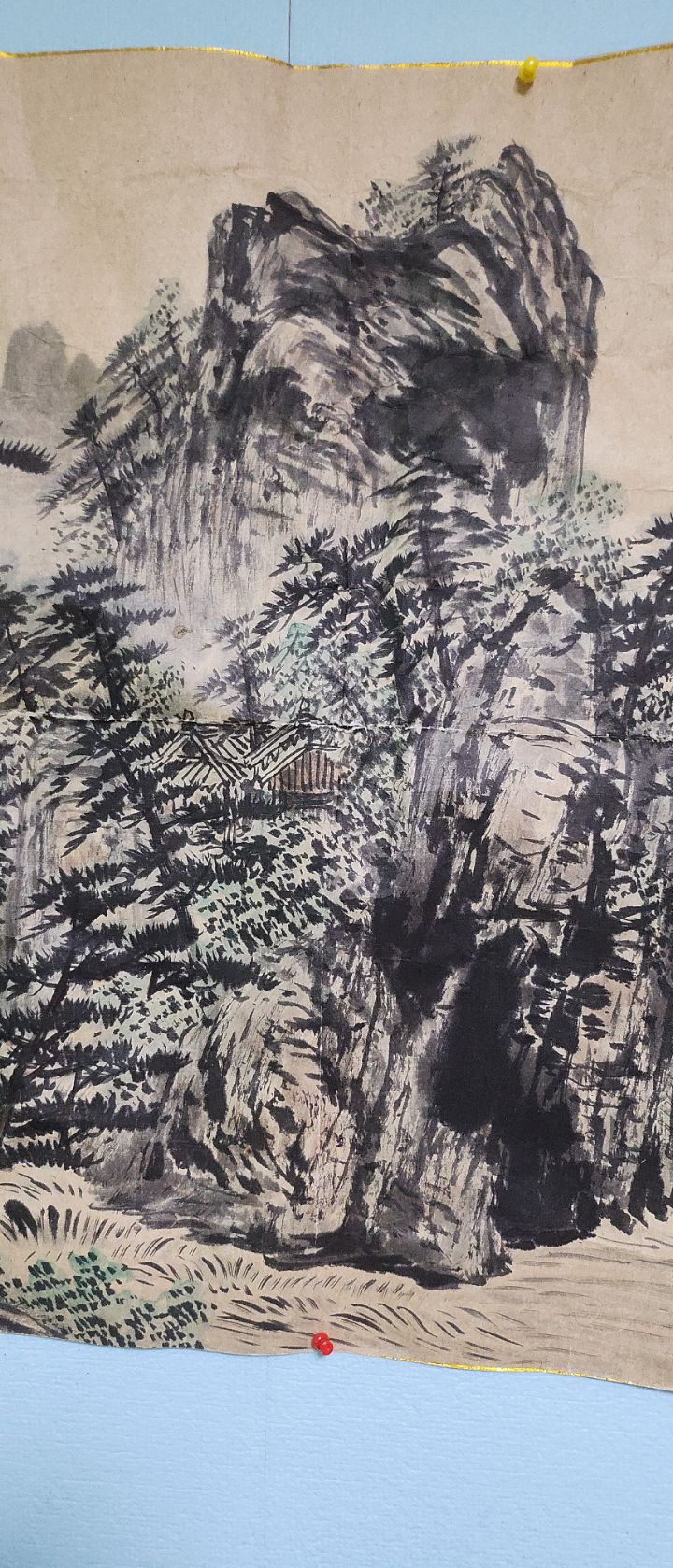 큰 바위와 소나무 사이에 계곡물이 흐르고 암자가 하나 있습니다 몽환적인 느낌도 나면서 진한 여운이 느껴집니다 남농 허건 제자로서 꽤 유명한 분의 그림입니다 엔틱 빈티지 소품 전시 자료 장식용 실사용 수집품 다 좋습니다