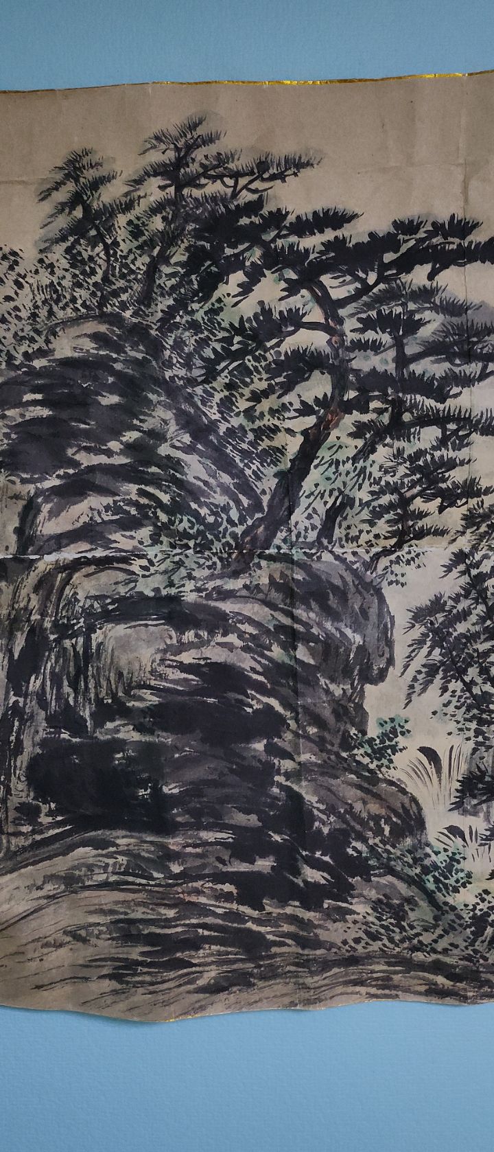 오래전에 그려진 그림으로 보입니다 그림 자체가 매우 강렬함을 느낍니다 바위도 강인해 보이고 나무도 아주 강렬해 보입니다 한국 산소와의 독창적인 예술성이 돋보이는 그림입니다