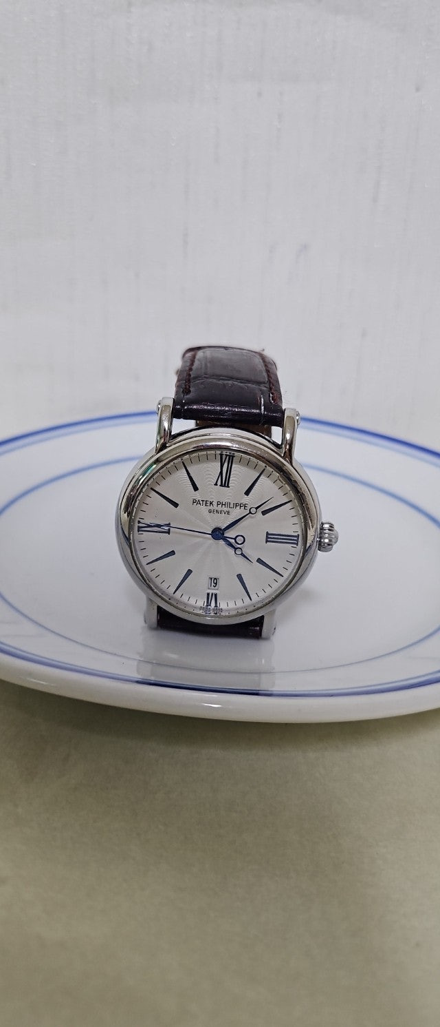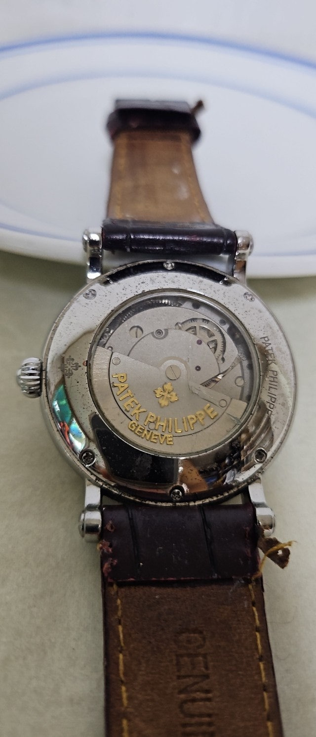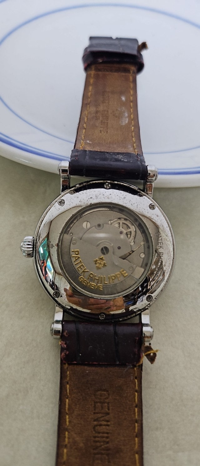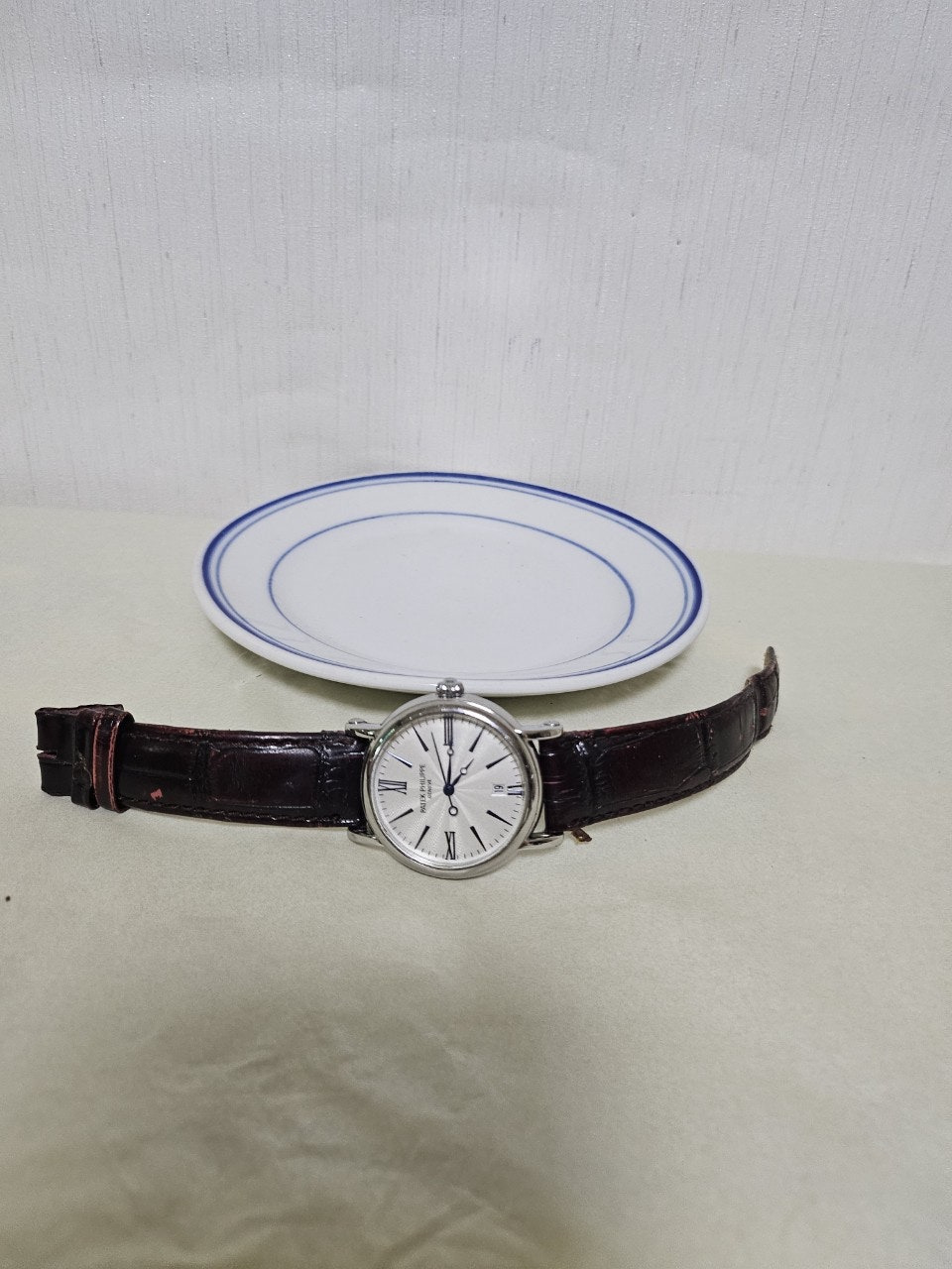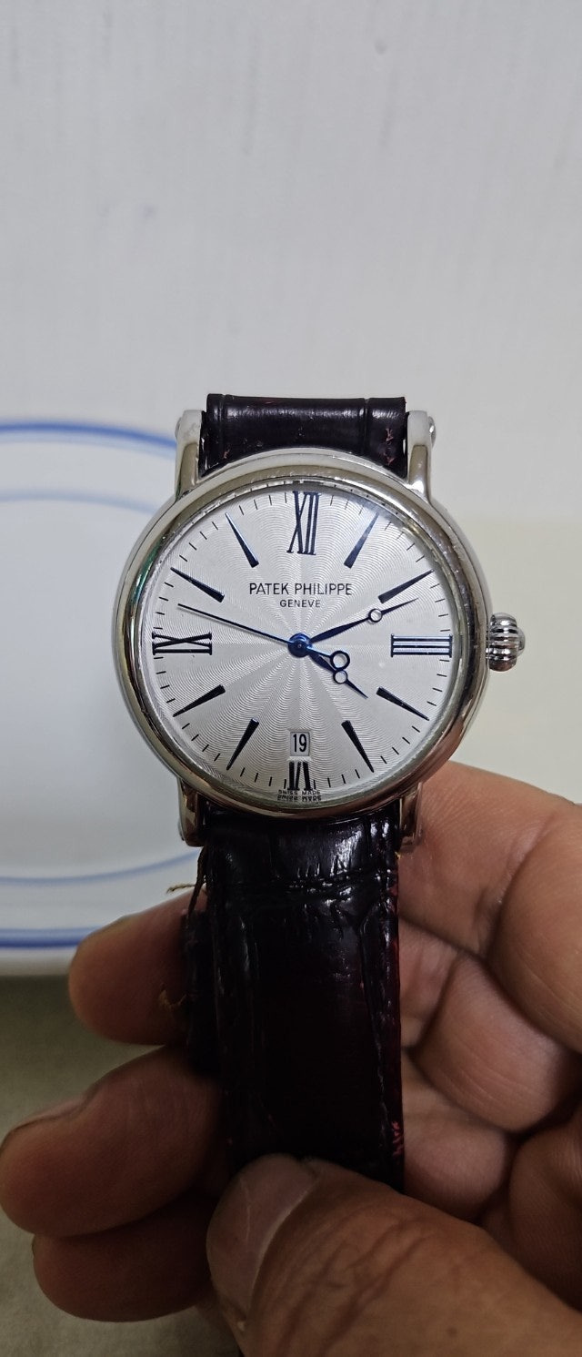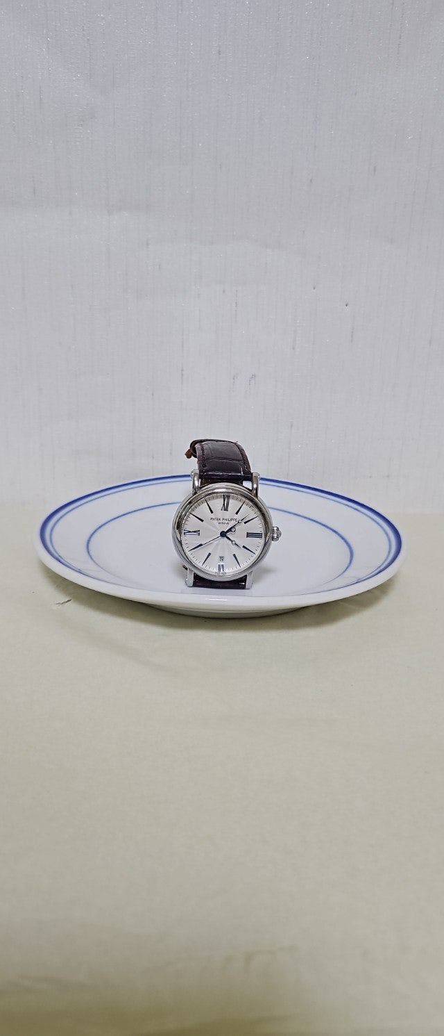 전 세계에서 최고의 명품 시계 중 하나로 알려진 파택 필립 제네브 오토매틱 시계입니다 백년이 넘은 전통있는 시계회사로 전 세계에서 최초로 시계 용두를 개발하여 센세이션을 일으킨 명품 시계 회사에서 만든 명품 시계 입니다
