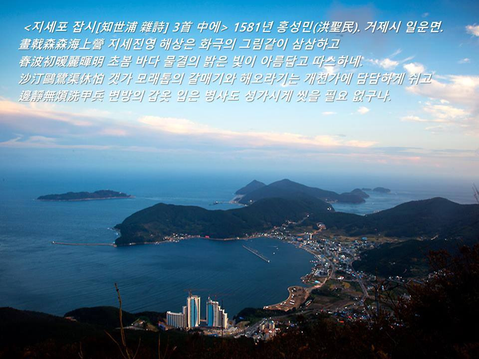 ◯ 다음은 홍성민(洪聖民,1536~1594) 선생이, 1581년(선조14년) 봄 음력 2월에 웅천 안골포에서 배를 타고 가덕도 영등포(구영등) 수영지를 거쳐 율포(구율포) 옥포 지세포 조라포(구조라) 오아포 진영, 거제도의 각종 누정과 각종 관아 건물(고현성), 거제면 명진리을 모두 순행하고 느낀 점을 시로 남겼다. 선생은 거제의 누정이나 각종 관아 건물, 거제7진영을 시로서 아름답게 읊어 거제도 고전 문학의 소중한 자산이 되고 있다.