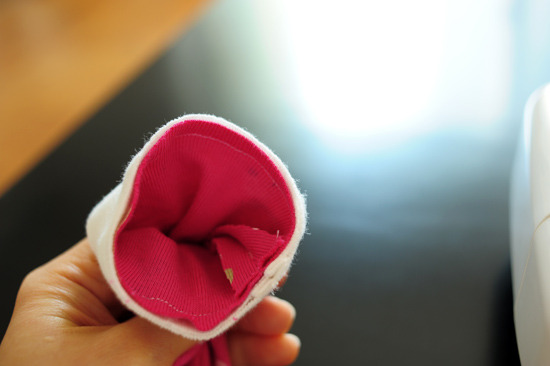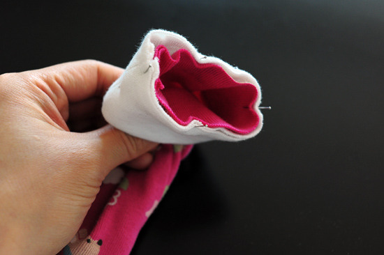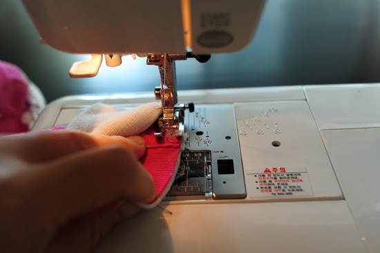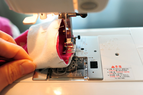 핑크색 원단은 그냥 두고 시보리만 살짝 잡아 당겨 박아주세요. 그럼 주름이 펴지면서 평평해져요.