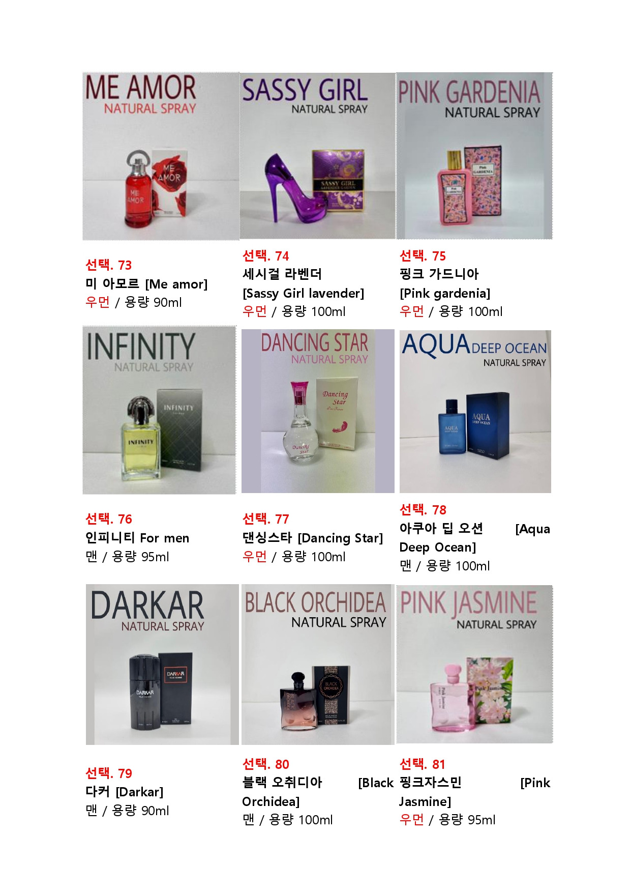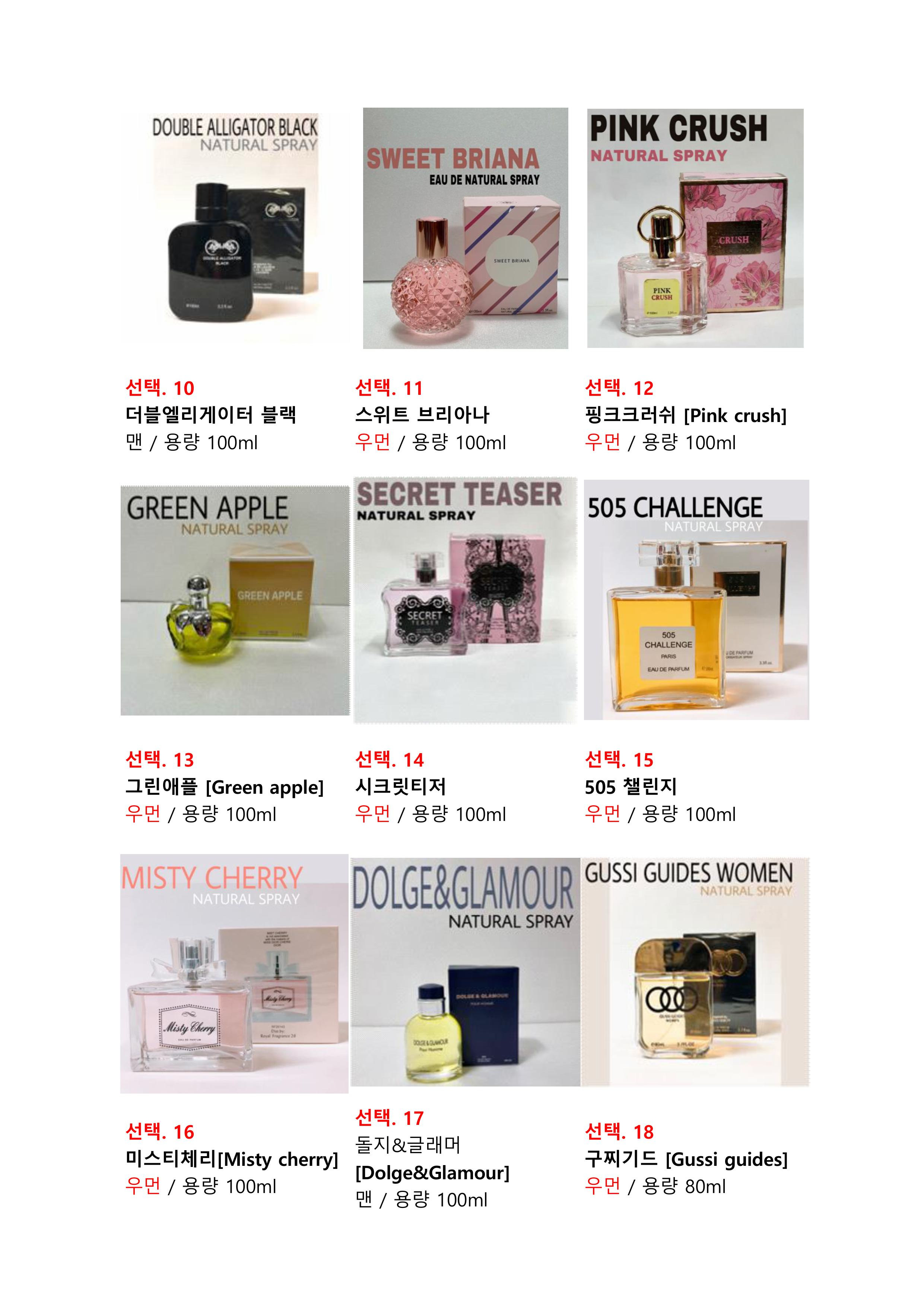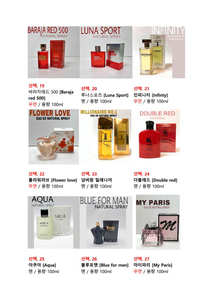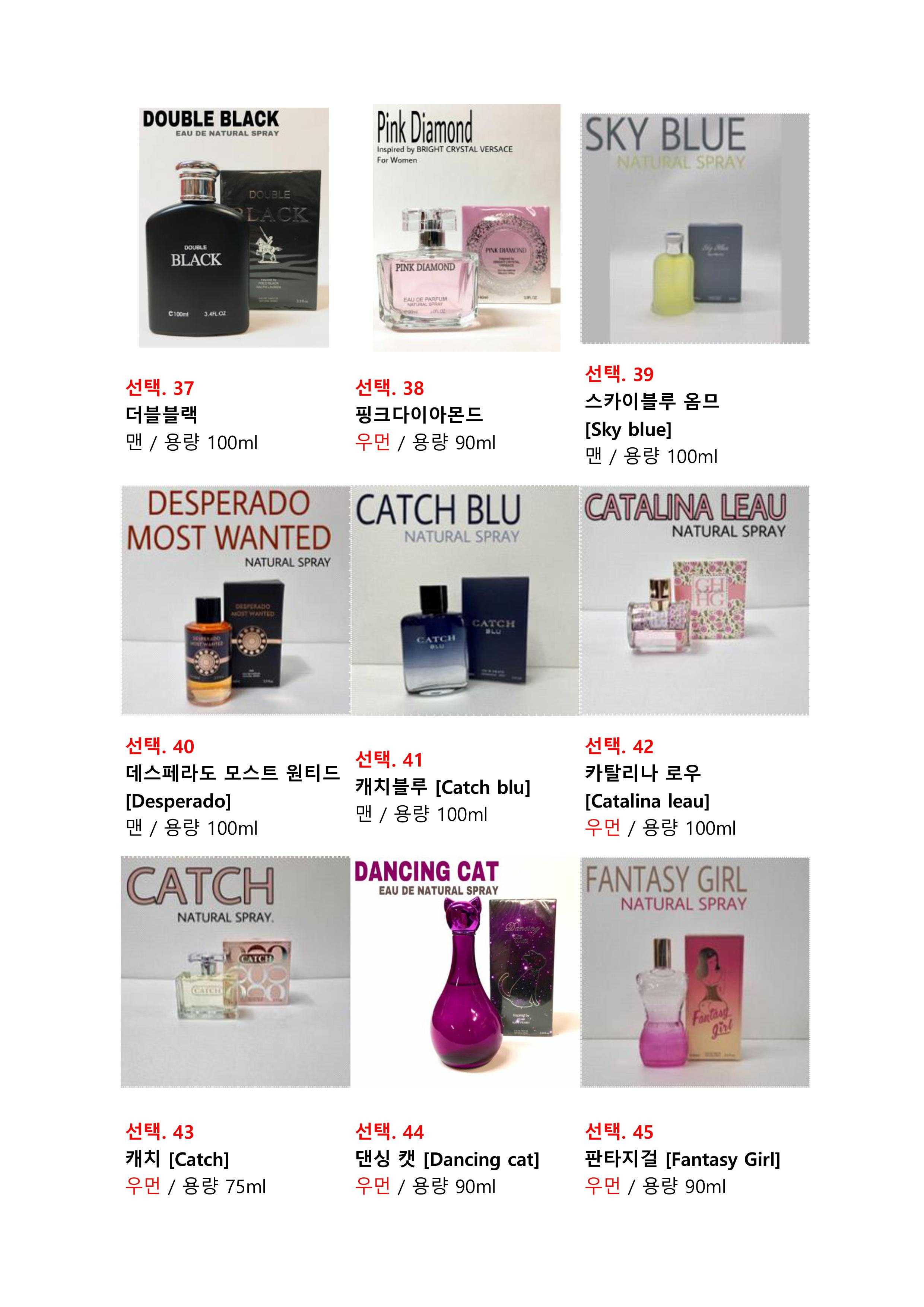 | 미국 브랜드 향수를 판매합니다. 본 업체는 미국 브랜드 향수 수입업체로 직수입하여 국내에 판매를 하고 있는 회사입니다. 도매, 소매를 하고 있으니 궁금한 사항이나 판매하고자 하는 업체는 연락바랍니다. 상호: 아인유통 전화번호: 010-5277-9076 주소: 경기도 시흥시 신천동 706-10호 1층창고(물류창고) 이메일: wgh9076@naver.com 카카오톡: woojh9076 자세한 향수들 이름과 이미지는 아래 첨부하였습니다. 확인후 향수의 번호와 이름, 이미지를 캡처해서 보내시면 보다 더 빠른 응답 가능합니다. |