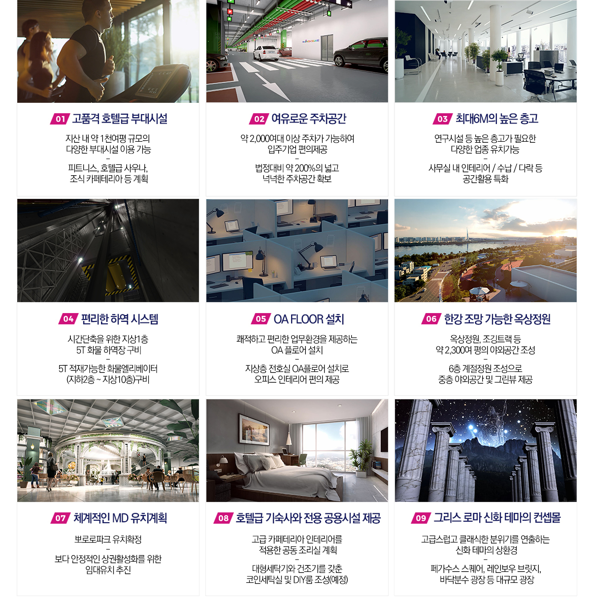 ◇ 세 부 입 지 - 현대엔지니어링시공 - 우수한입지 (한국전력공사, 국민건강보험공단) - 수석대교 건설예정 - 지하철 9호선예정 - 뽀로로 테마파크 입점예정 - 전매제한 없음 - 대출 신용도에 따라 잔금시 대출가능(70~90%) - A동 외측층고 4M(층수에 따라 다름) - B동 외측층고 6M(층수에 따라 다름) - 호텔급부대시설(스파,피트니스,카페페라아 등), 야외옥상정원 - 편리한 하역시스템 (지상1층 5T화물 하역장 및 5T 화물엘리베이터)