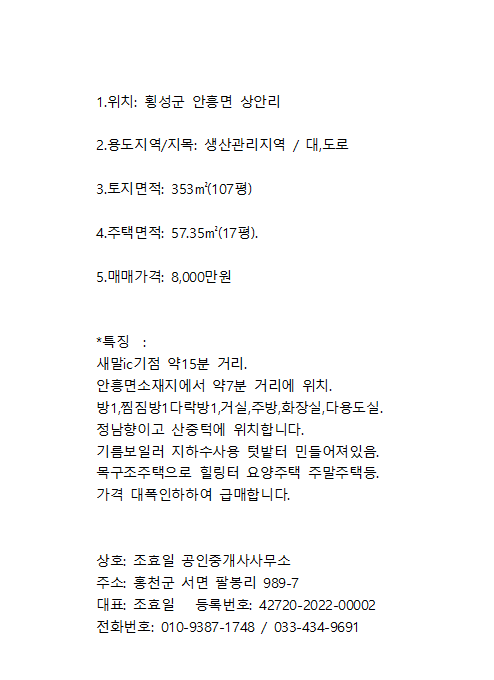 횡성군 안흥면 산중턱 목구조 시골주택,찜질방 8천만 급매 작성자조효일공인중개사|작성시간26.02.25|조회수9 목록 댓글 0 글자크기 작게가 글자크기 크게가 다음검색 현재 게시글 추가 기능 열기 북마크 공유하기 신고 센터로 신고 댓글 댓글 0 댓글쓰기 댓글 리스트