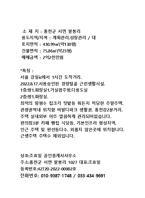 홍천 서면 비발디파크 5분 해잘드는 근생 주말주택 23평 2억2천만원 작성자조효일공인중개사|작성시간26.02.27|조회수9 목록 댓글 0 글자크기 작게가 글자크기 크게가 다음검색 현재 게시글 추가 기능 열기 북마크 공유하기 신고 센터로 신고 댓글 댓글 0 댓글쓰기 댓글 리스트