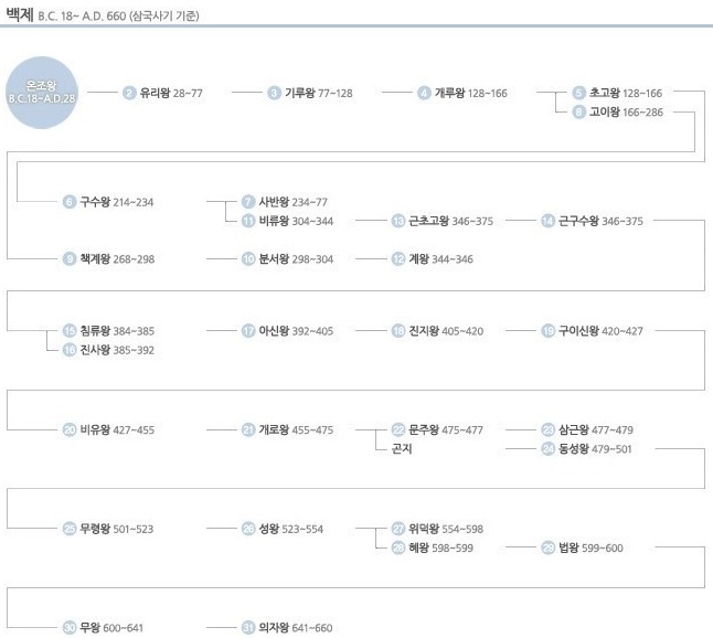 ▶ 제1대 온조왕 ▶제2대 유리왕 ▶제3대 기루왕 ▶제4대 개루왕 ▶제5대 초고왕 ▶제6대 구수왕 ▶제7대 사반왕 ▶제8대 고이왕 ▶제9대 책계왕 ▶제10대 분서왕