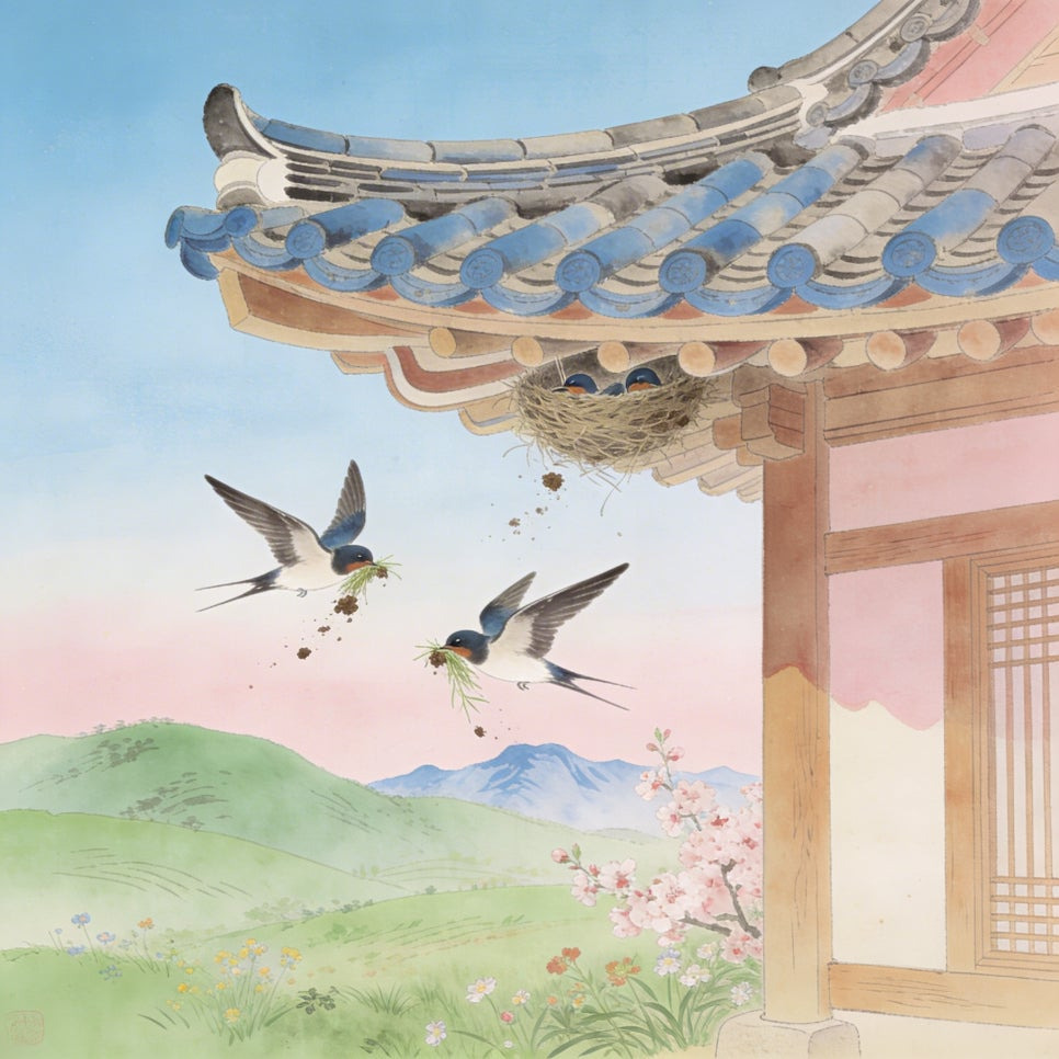 오늘 4월 5일은 24절기 가운데 다섯 번째 절기인 청명(淸明) 입니다. 한자 그대로 '맑을 청(淸)'에 '밝을 명(明)'을 써서, 하늘이 차츰 맑아지고 봄빛이 환하게 펼쳐지는 날을 의미합니다. 태양의 황경이 15도에 이르는 이 시점, 선조들은 자연 속 작은 생명의 움직임 — 바로 제비의 귀환과 집짓기 행동 — 을 통해 계절의 변화를 정밀하게 감지했습니다.[1]