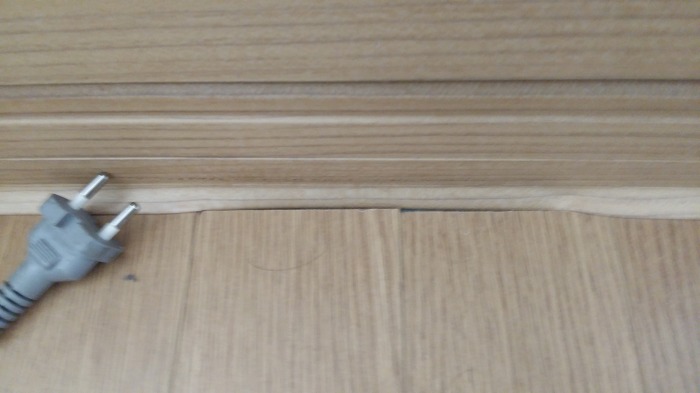 4. 걸레받이 하단이 휘어서 마루 밑으로 꺽였을때는(신축아파트는 강화마루 시공시 2단 걸레받이를 사용합니다. 2단 걸레받이는 아래 사진에서 보듯이 플라스틱 제품으로 위, 아래가 호크식으로 되어있습니다 ) 끌로 하단밑에 넣어 위로 제낀후 헤어드라이기로 약한열을 가하면서 펴주면은 깨끗하게 복원됩니다. 쉽게하시려면 하단을 빼서 하셔도 됩니다.(단 짐이 없는경우에)