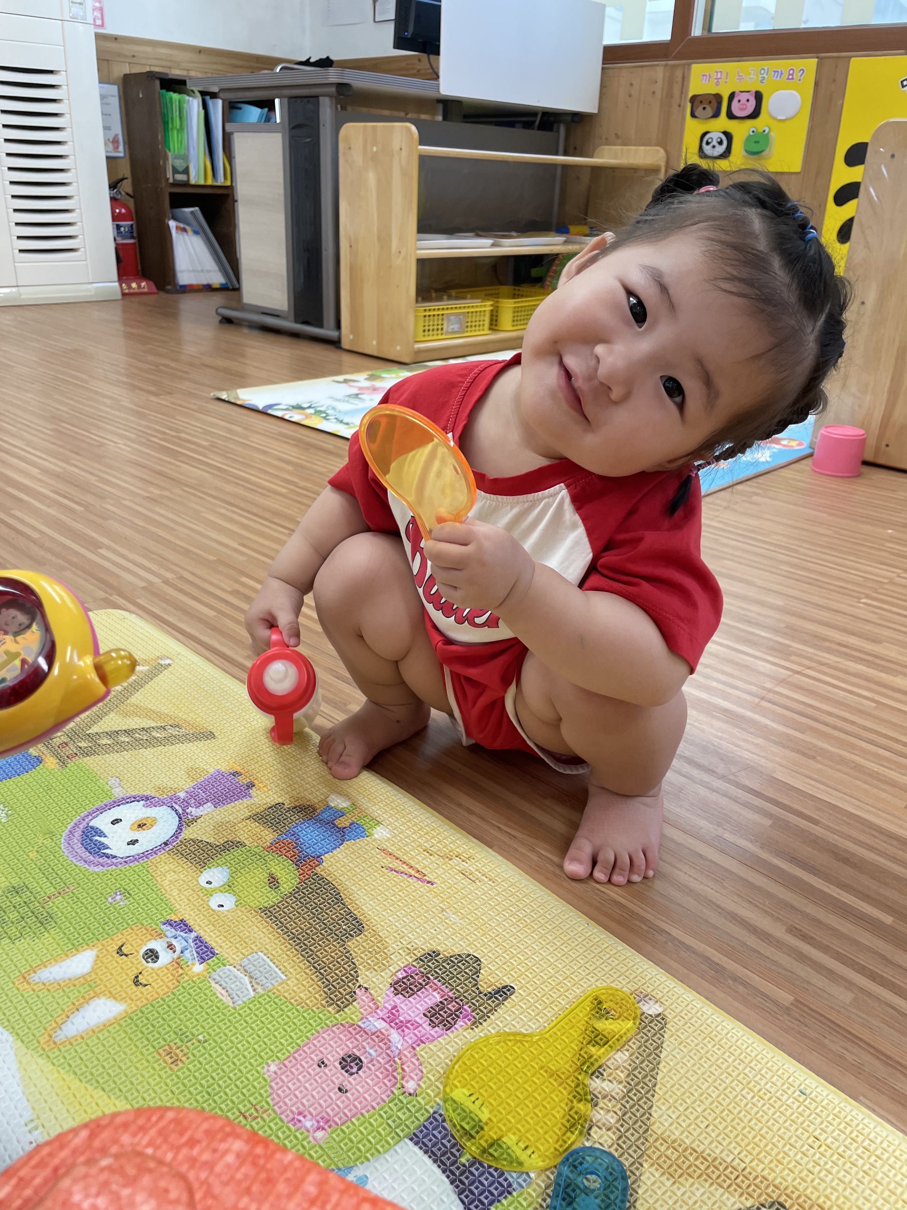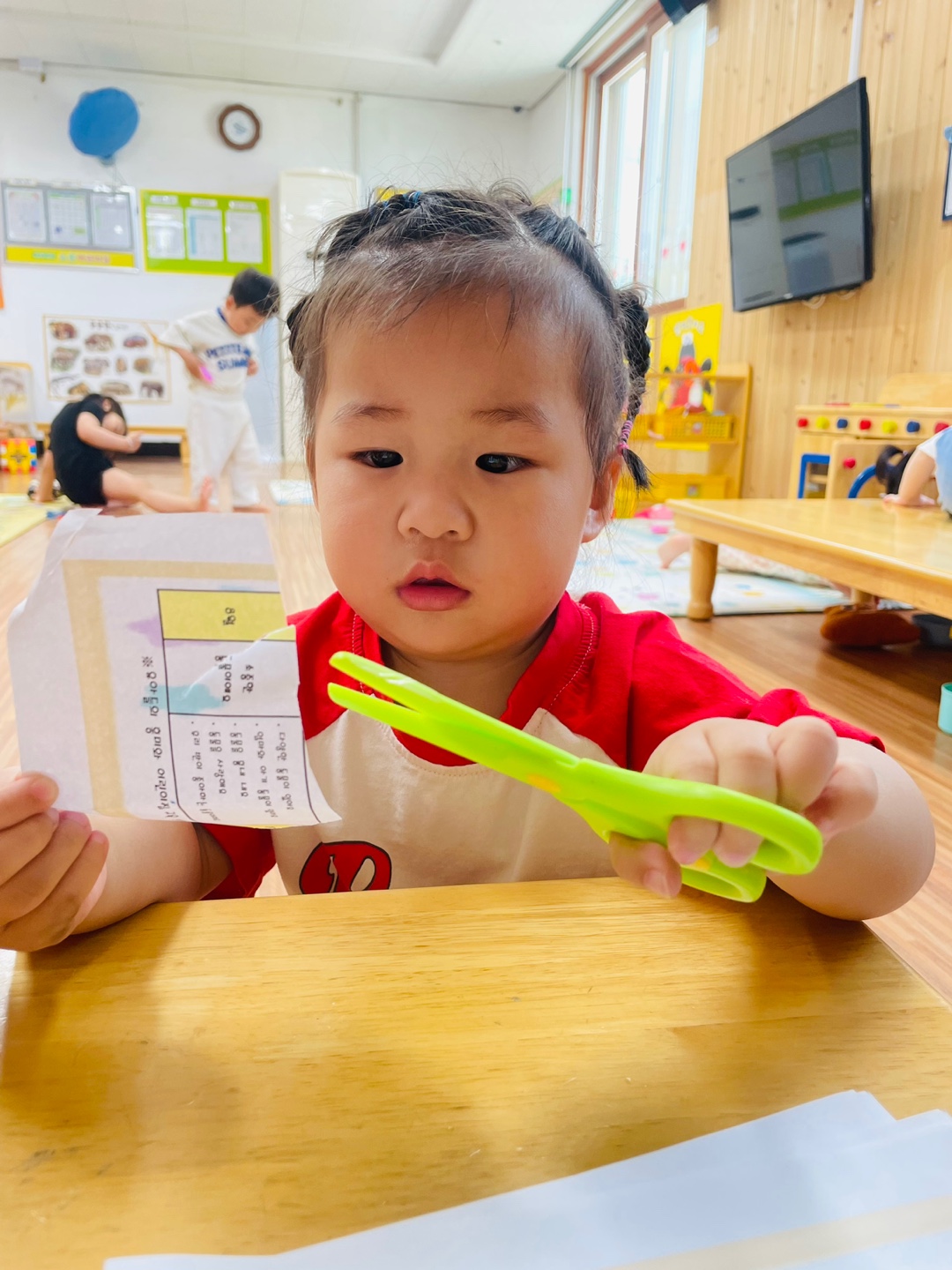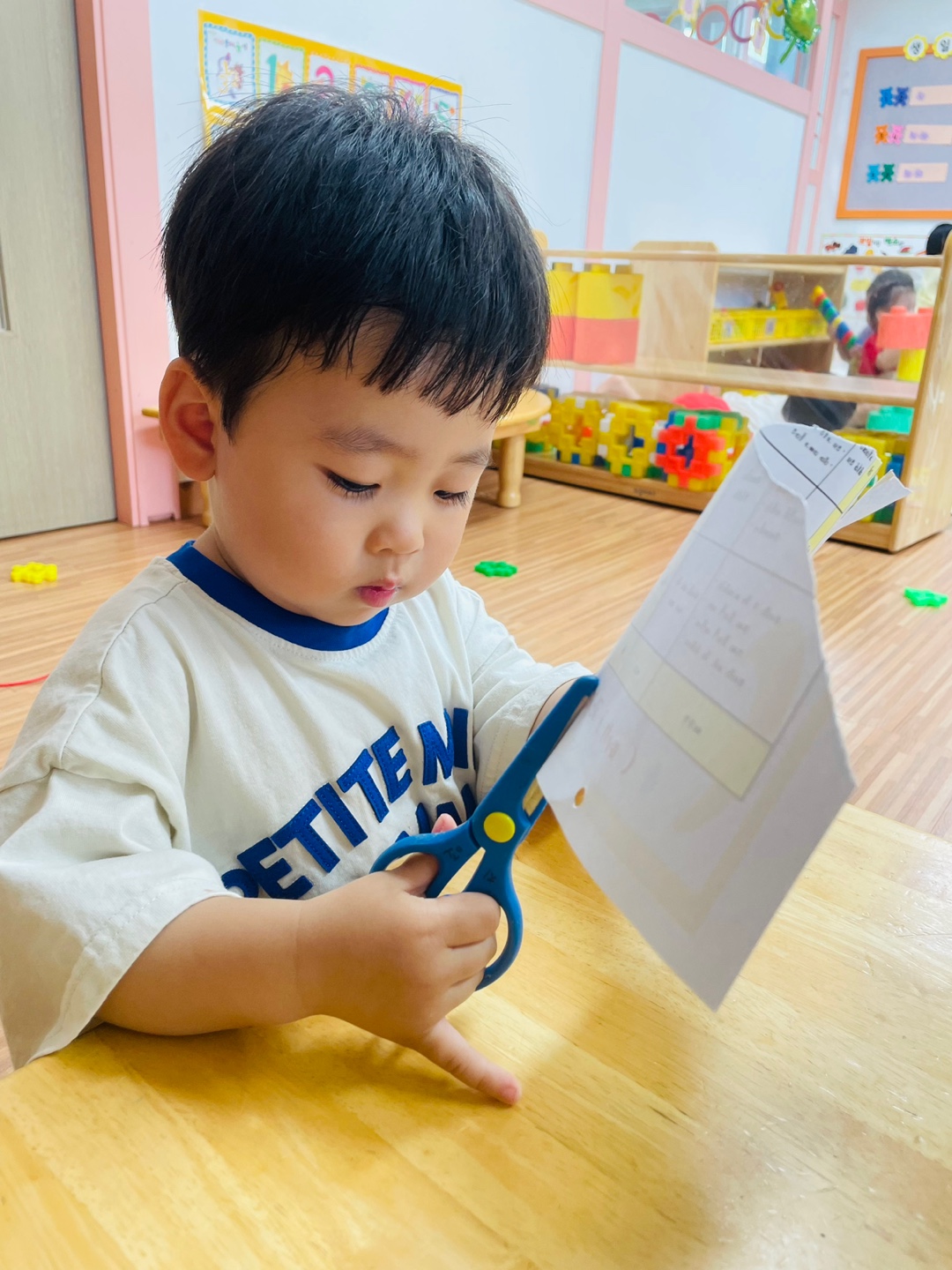 오늘은 우리 초롱이들과 처음으로 슥삭슥삭 가위질을 해보았어요! 날이 없는 안전한 가위를 사용하여 가위 사용법을 알아보고 선생님과 함께 종이도 잘라보았답니다~ 가위질에 조금 능숙해진 친구들은 날이 있지만 영아들이 사용할 수 있는 안전한 가위로 업그레이드 하여 사용해보기도 하였어요^^ 가위질을 하면서 손의 힘도 기르고 자르는 성취감을 느끼며 꽤나 집중하는 모습이었답니다💕