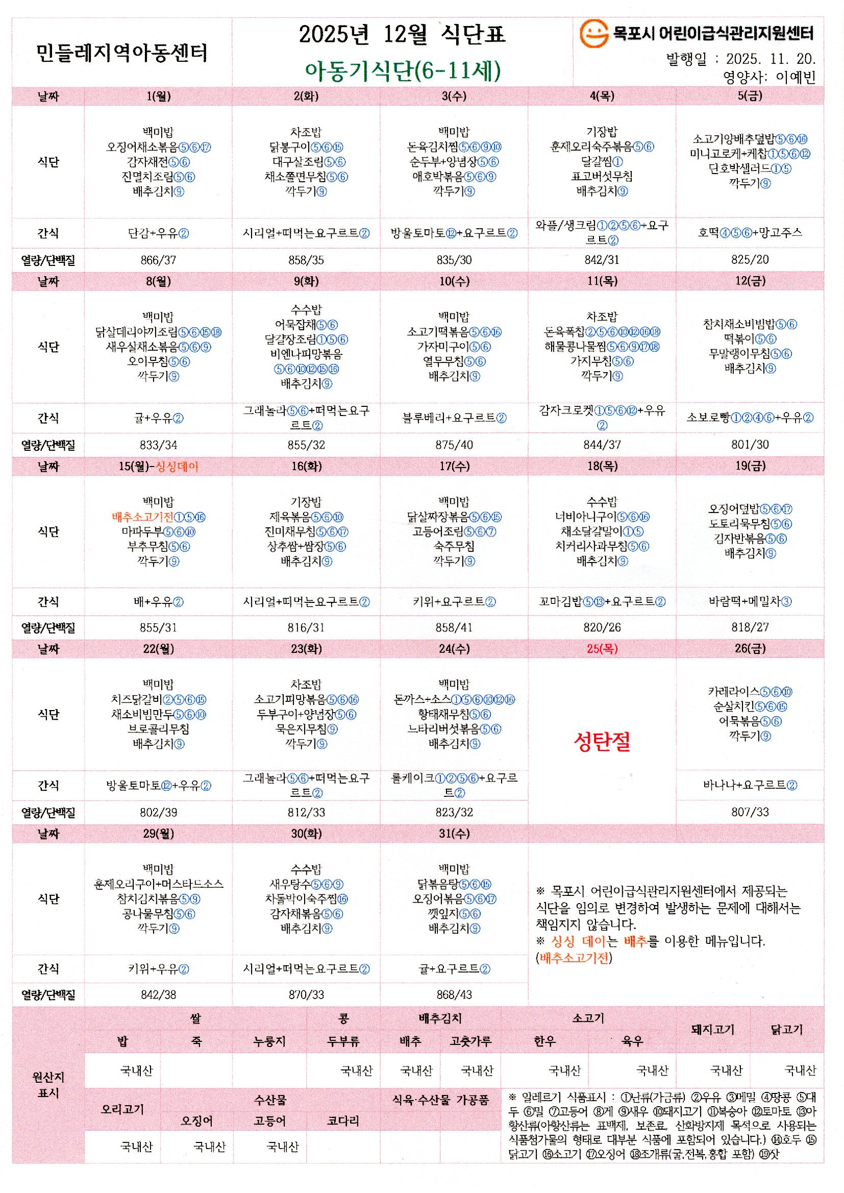 2025년 12월 식단표 작성자moonbr|작성시간25.12.31|조회수8 목록 댓글 0 글자크기 작게가 글자크기 크게가 다음검색 현재 게시글 추가 기능 열기 북마크 공유하기 신고 센터로 신고 댓글 댓글 0 댓글쓰기 답글쓰기 댓글 리스트