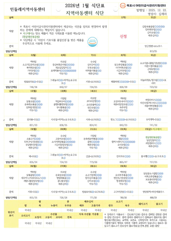 2026년 1월 식단표 작성자alice|작성시간26.03.16|조회수0 목록 댓글 0 글자크기 작게가 글자크기 크게가 다음검색 현재 게시글 추가 기능 열기 북마크 공유하기 신고 센터로 신고 댓글 댓글 0 댓글쓰기 답글쓰기 댓글 리스트