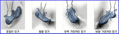 * 염좌 : 근육이나 건(힘줄) 또는 인대가 외력에 의해 지나치게 늘어나 그중 일부가 찢어지거나 끊어진 것을 말한다.