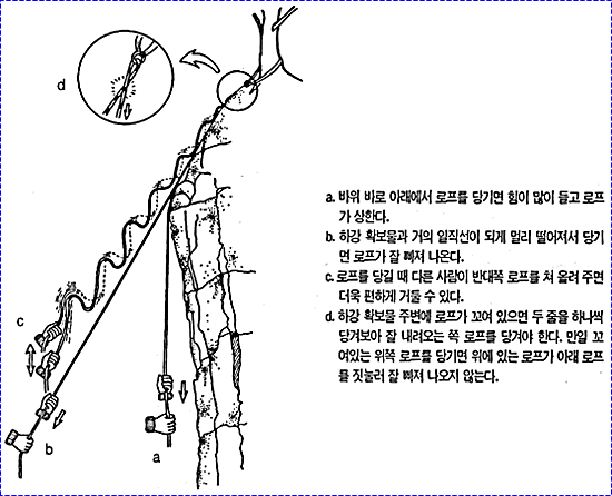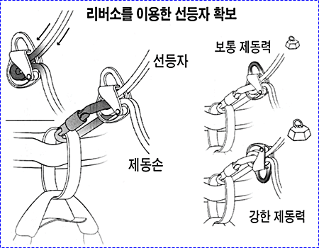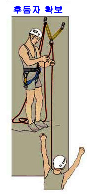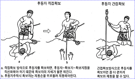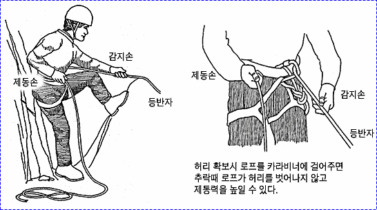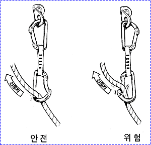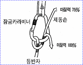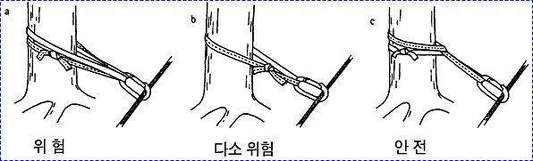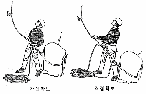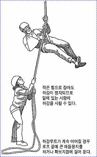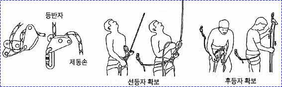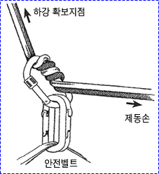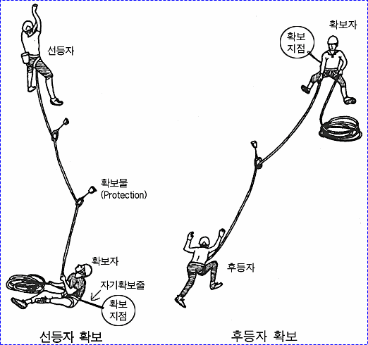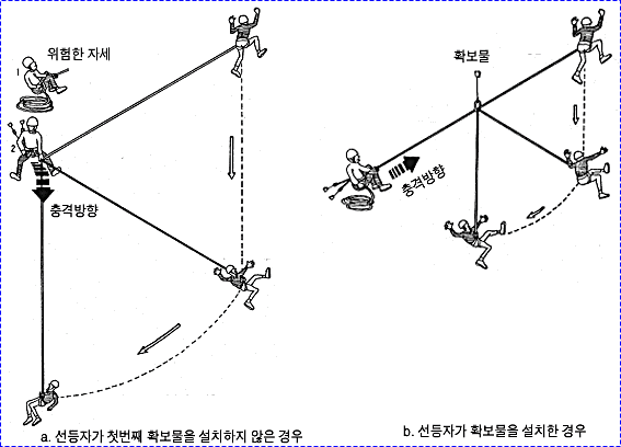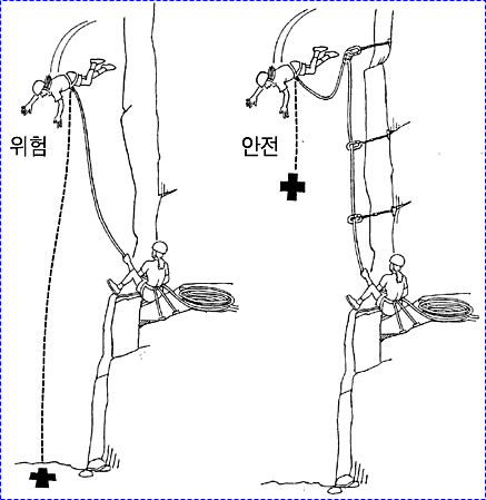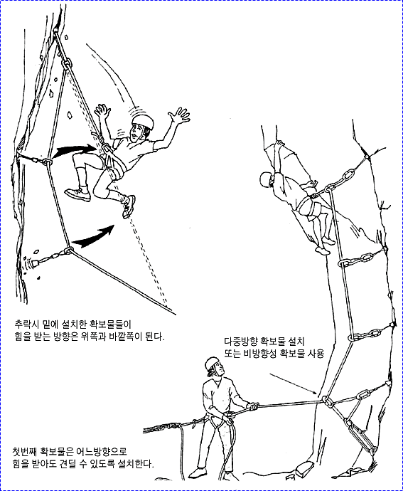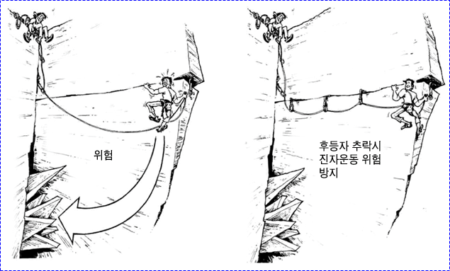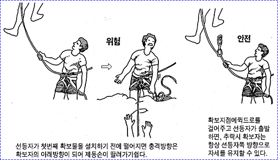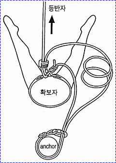 으로 인한 부상을 방지하기 위하여 상부 확보지점에 도르레나 카라비너 등을 설치하여 로프를 통과시켜 확보를 받으며 등반할 수 있