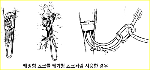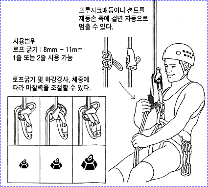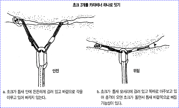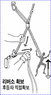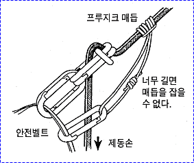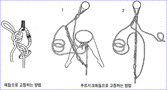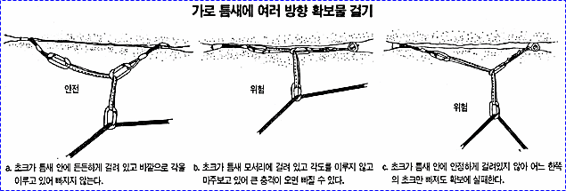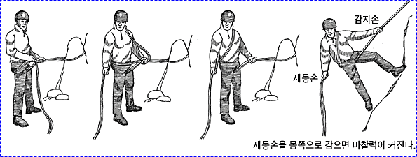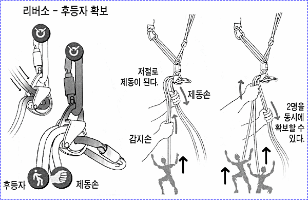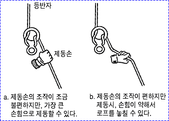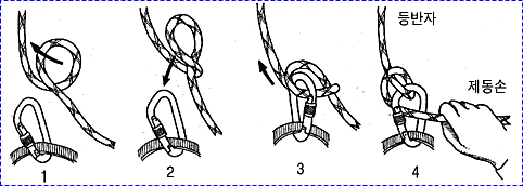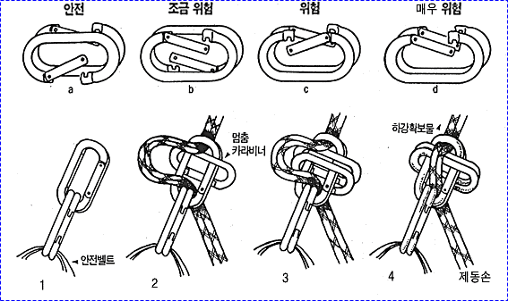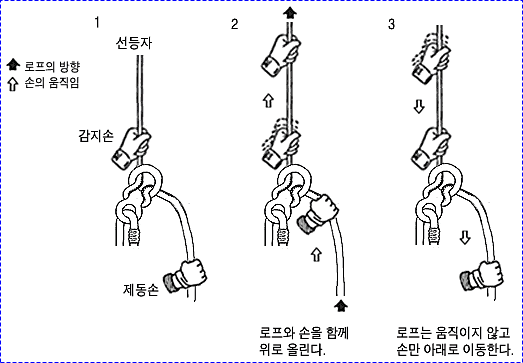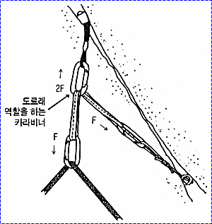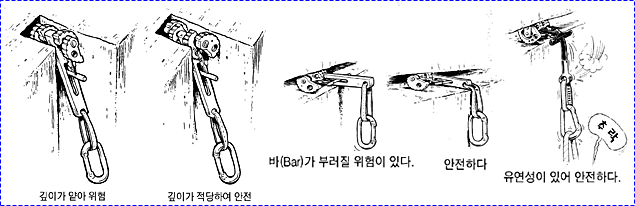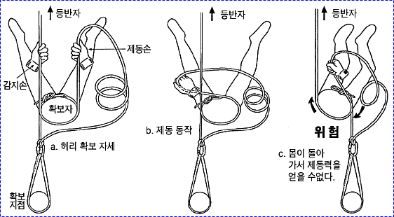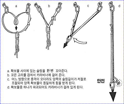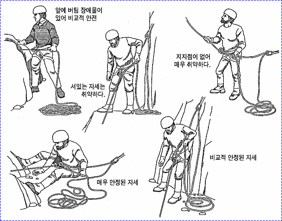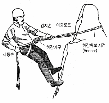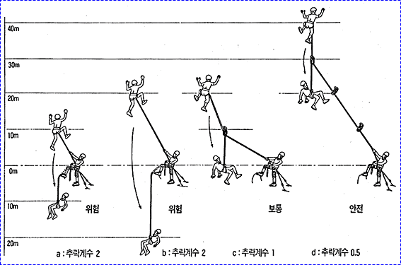 으로 인한 부상을 방지하기 위하여 상부 확보지점에 도르레나 카라비너 등을 설치하여 로프를 통과시켜 확보를 받으며 등반할 수 있