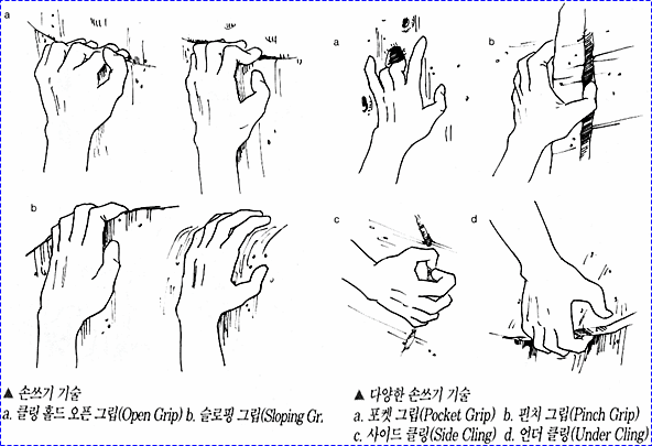 손발을 바꾸는 기술, 등반자세등 기본적인 기술을 충분히 익혀야만 손가락이나 어깨 근육을 보호할 수 있다.