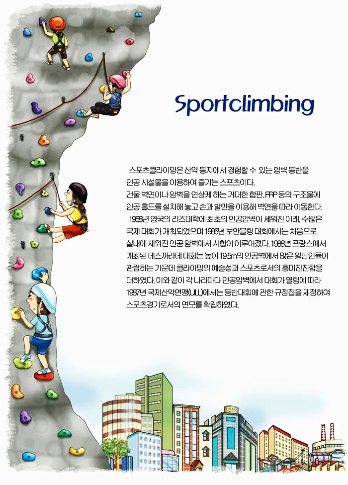 할 수 있는 스포츠로 발전되었고 이제는 이러한 스포츠 클라이밍만 즐기는 사람들도늘어만 가고 있는 실정이다.