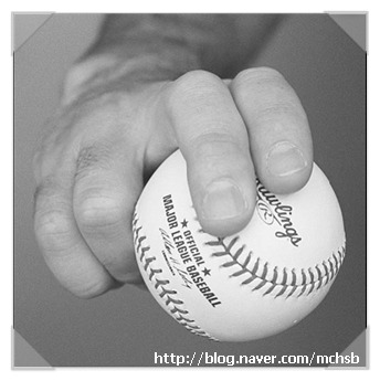1. 검지와 중지를 공 중앙에서 약간 바깥쪽, 실밥 간격이 넓은 부분에 대고 잡는다