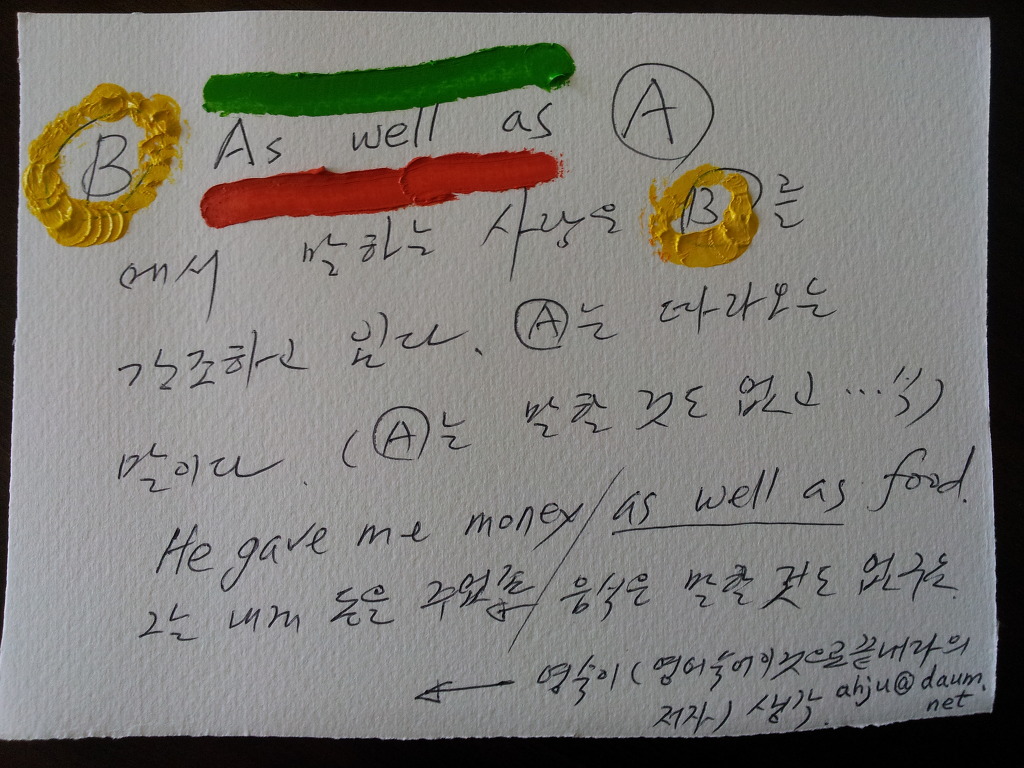 · He gave me not only food but also money. = He gave me money as well as food. (그는 내게 음식뿐만 아니라 돈도 주었다.) |