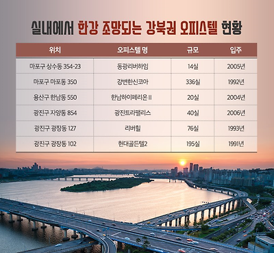 한강조망뷰가 나오는 오피스텔은 강북권에 6~7곳 밖에 없습니다.