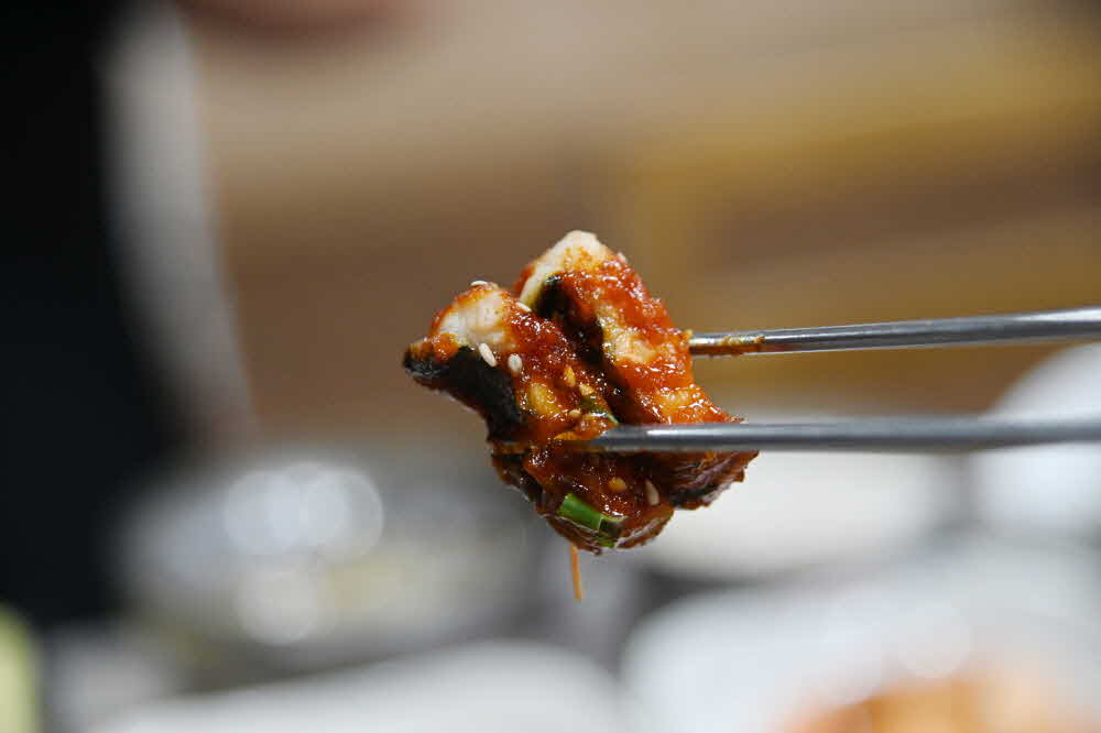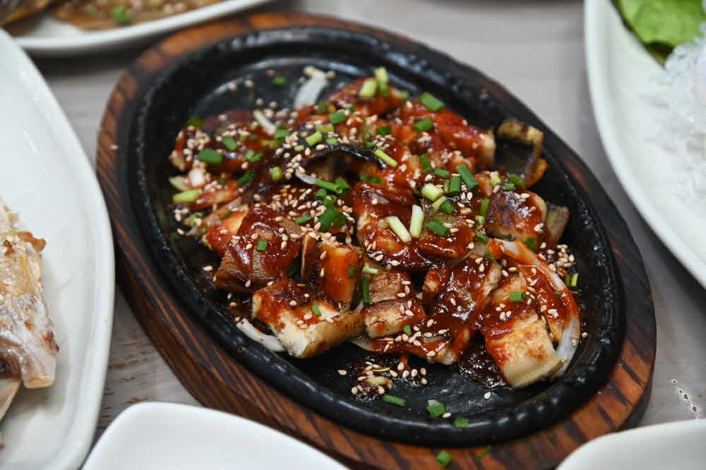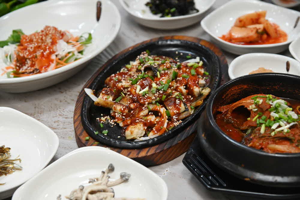 장어구이정식은 매콤 달콤한 고추장 양념이 일품이지요.