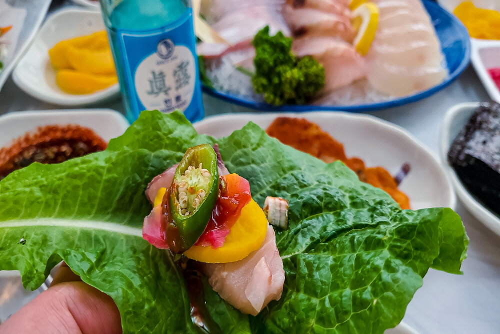 밤바다를 보며 신선한 회와 삼합을 즐기며