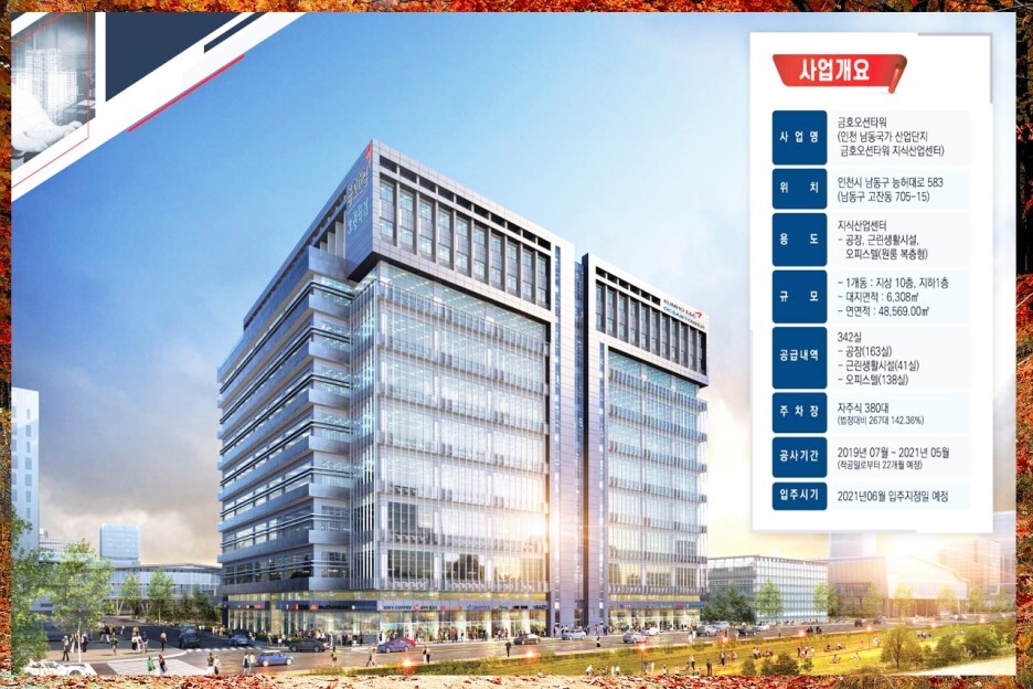 오늘소개할 분양소식은 인천 금호오션타워의 아파트형공장 지식산업센터,분양소식인데요 이곳은 인천 남동국가 산업단지로 인천시 남동구 능허대로 583에 속하는 곳입니다. 용도는 지식산업센터 공장,근린생활시설,오피스텔,원룸,복층형으로 구분되어 있으며 1개동 지하1층에서 지상10층으로 이루어져 있습니다. 공급내역은 342실이며 공장은 163실,근린생활시설은 41실,오피스텔은 138실로 구성됩니다. 주차는 자주식380대로 법정대비267대입니다. 착공은 2019년7월부터 2021년 5월로 진행됩니다.