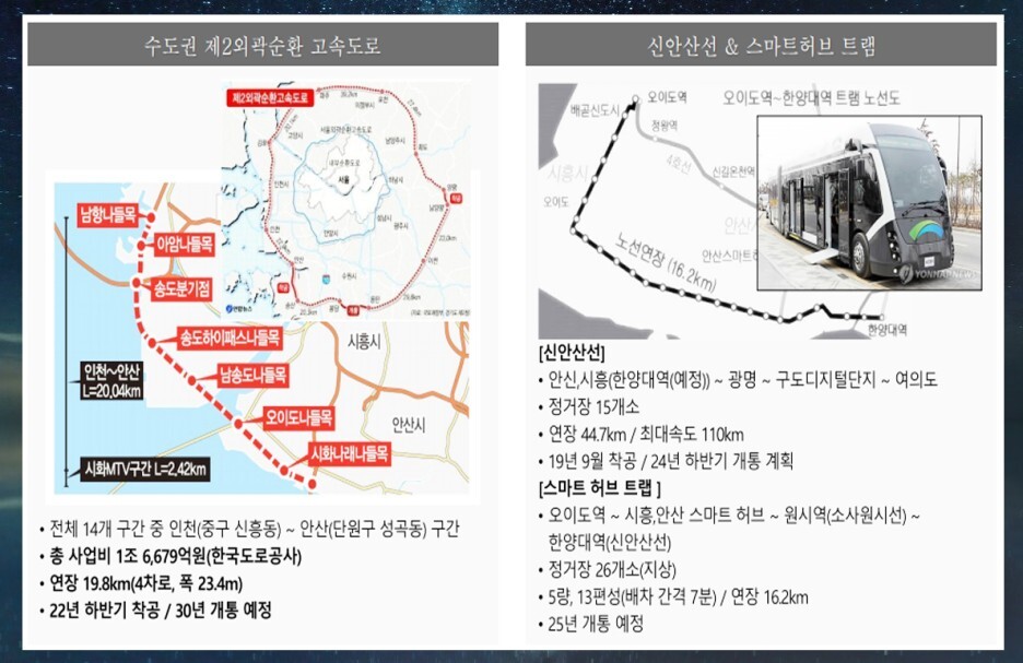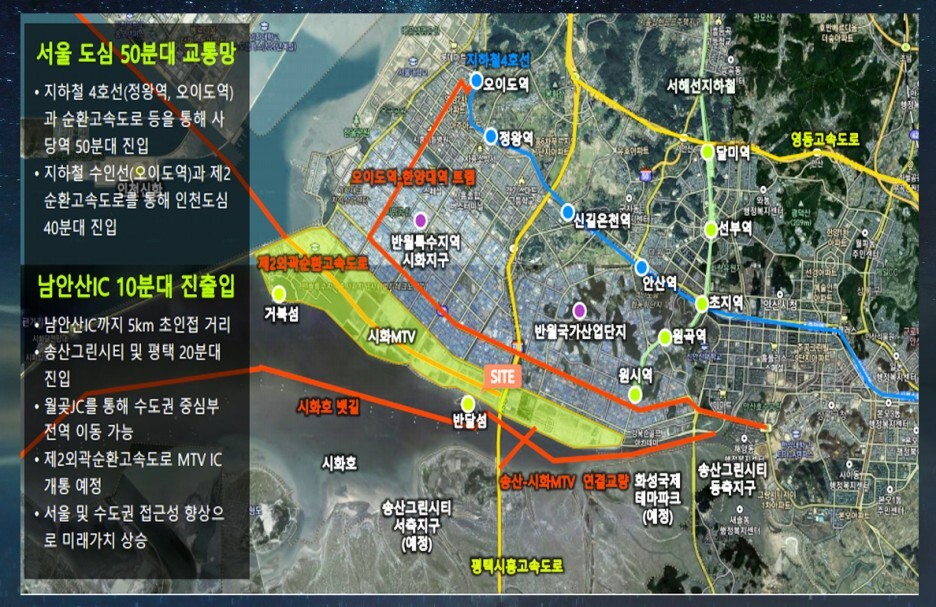 개발과 동시에 교통망도 계속적으로 확장되고 개발되고 개통되고 있는데요, 제2외곽순환고속도로가 개통 예정에 있고 평택시흥고속도로를 통해 협역/광역 지역의 접근성이 더욱 뛰어난 조건을 가지고 있으며 또한 한양대-오이도 트램을 도입하게 되면 지하철4호선, 서해선과 연계하여 대중교통 접근성 개선되기 때문에 대중교통편 이용을 통해 서울 도심 50분대 교통망을 형성하게 됩니다.