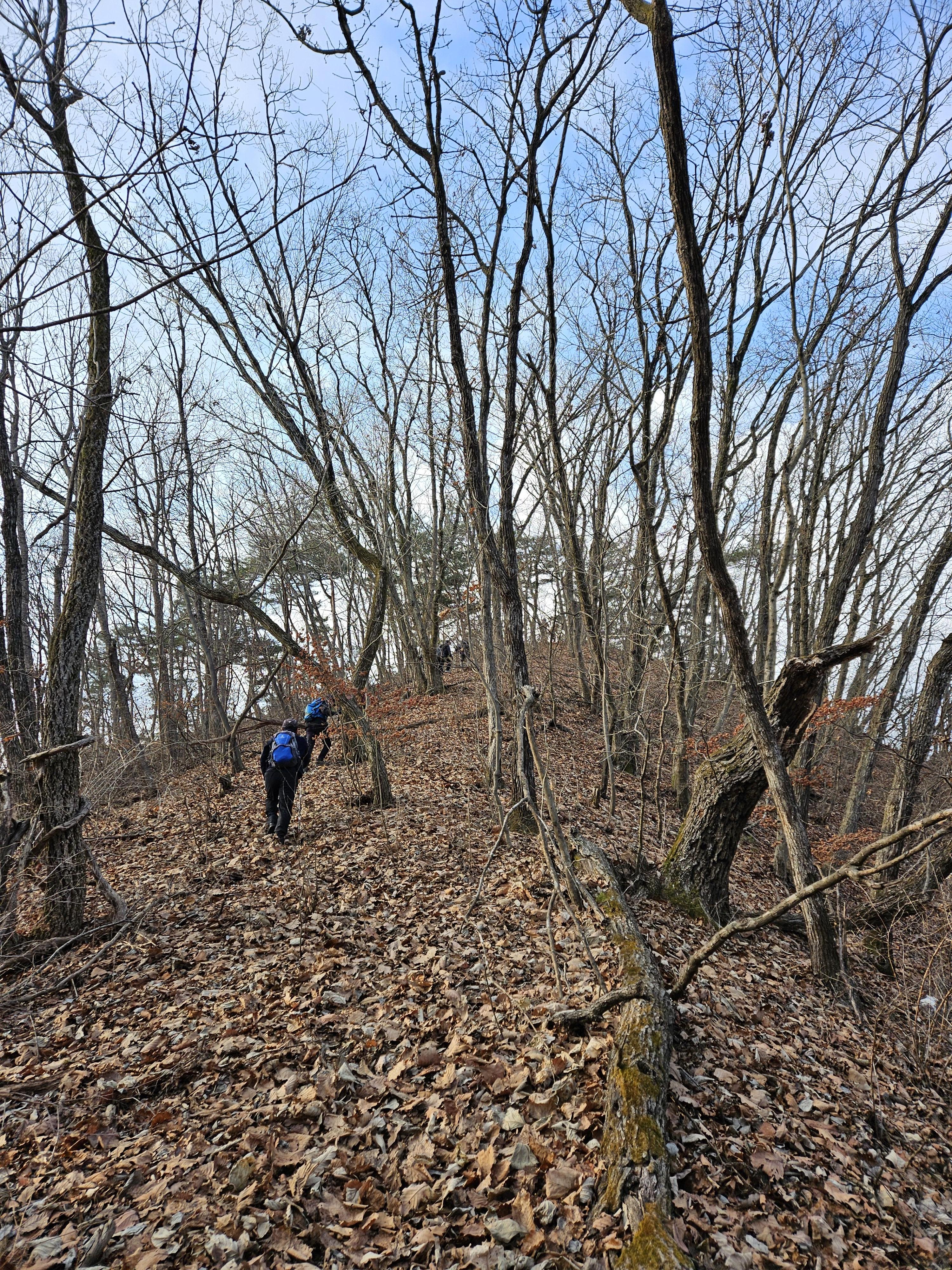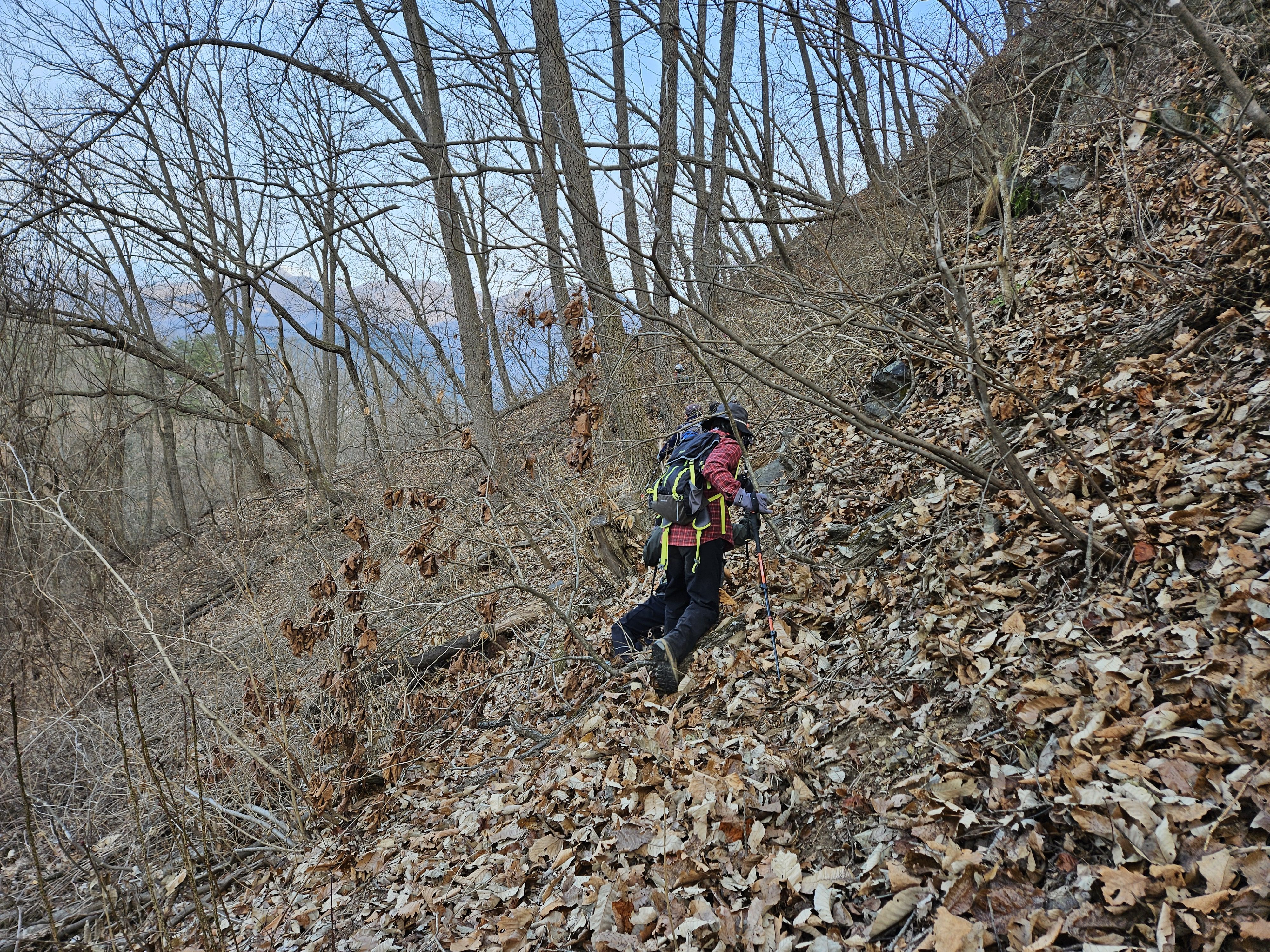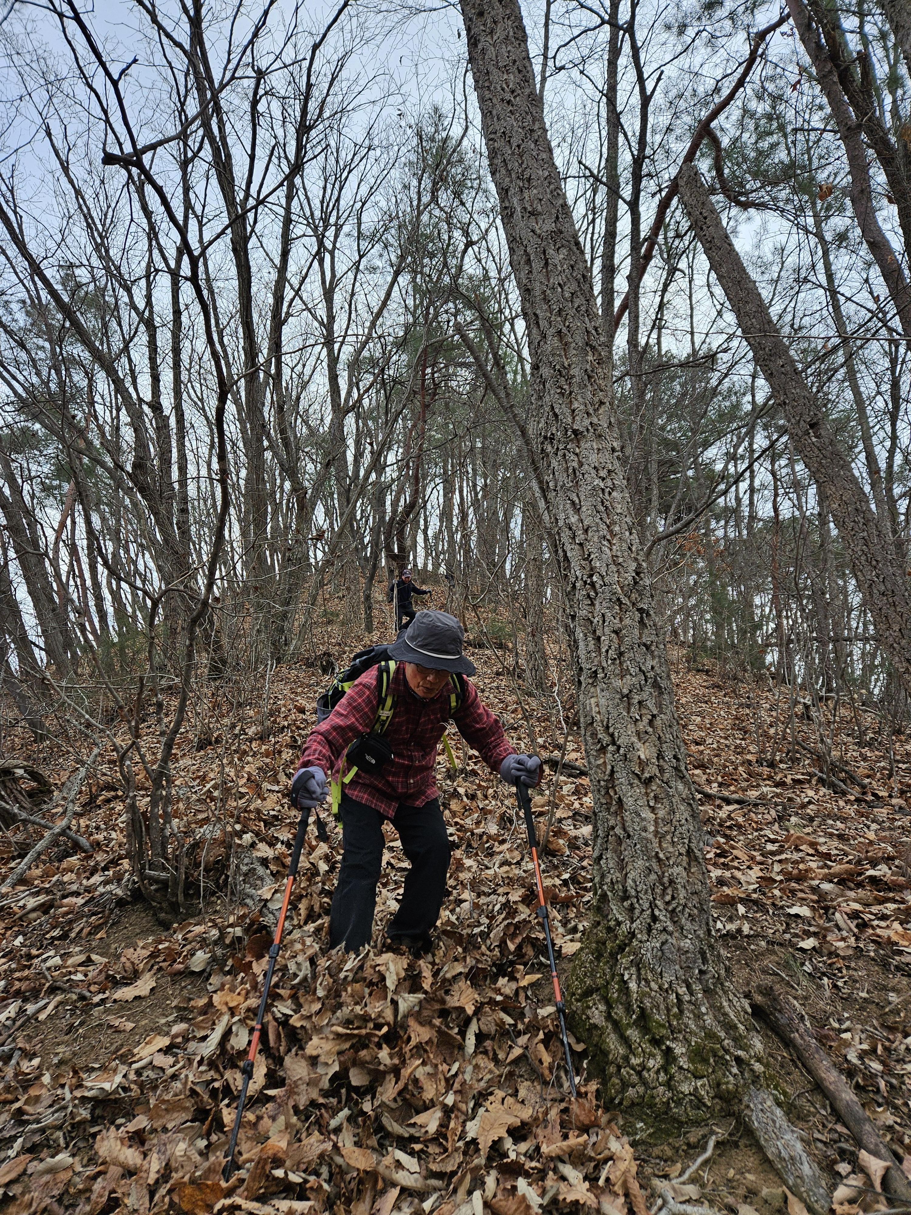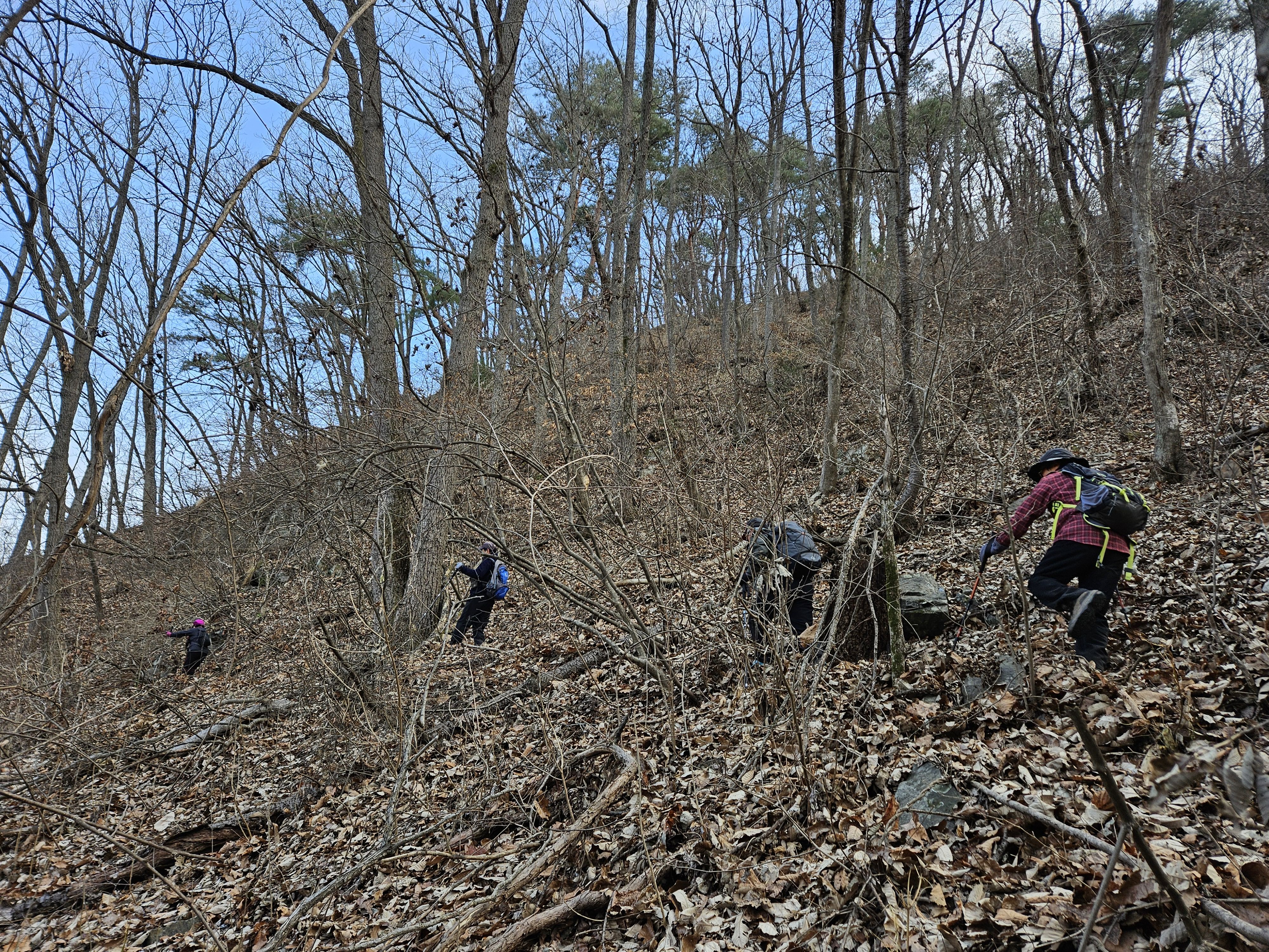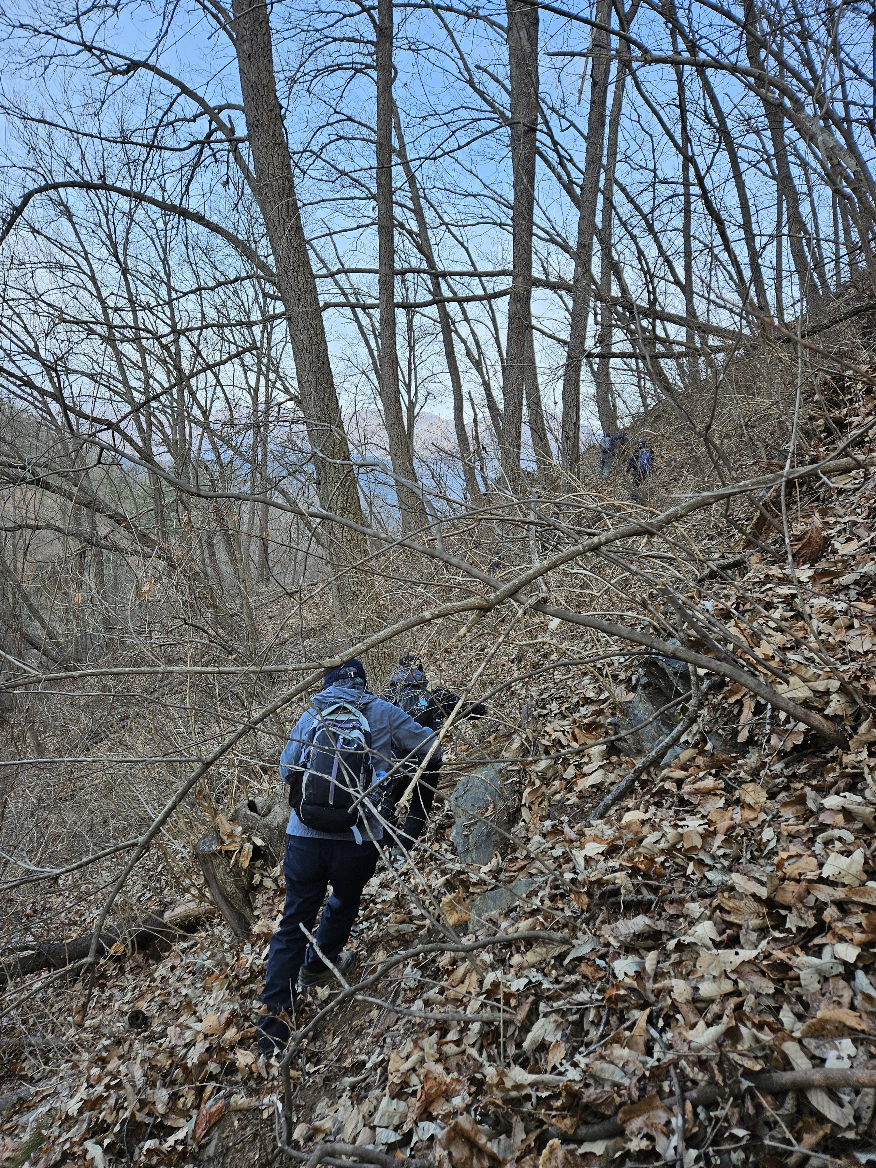 쓰러진 잡목에 쌓인 낙엽에 비스듬한 산허리...혼신의힘 발휘중...