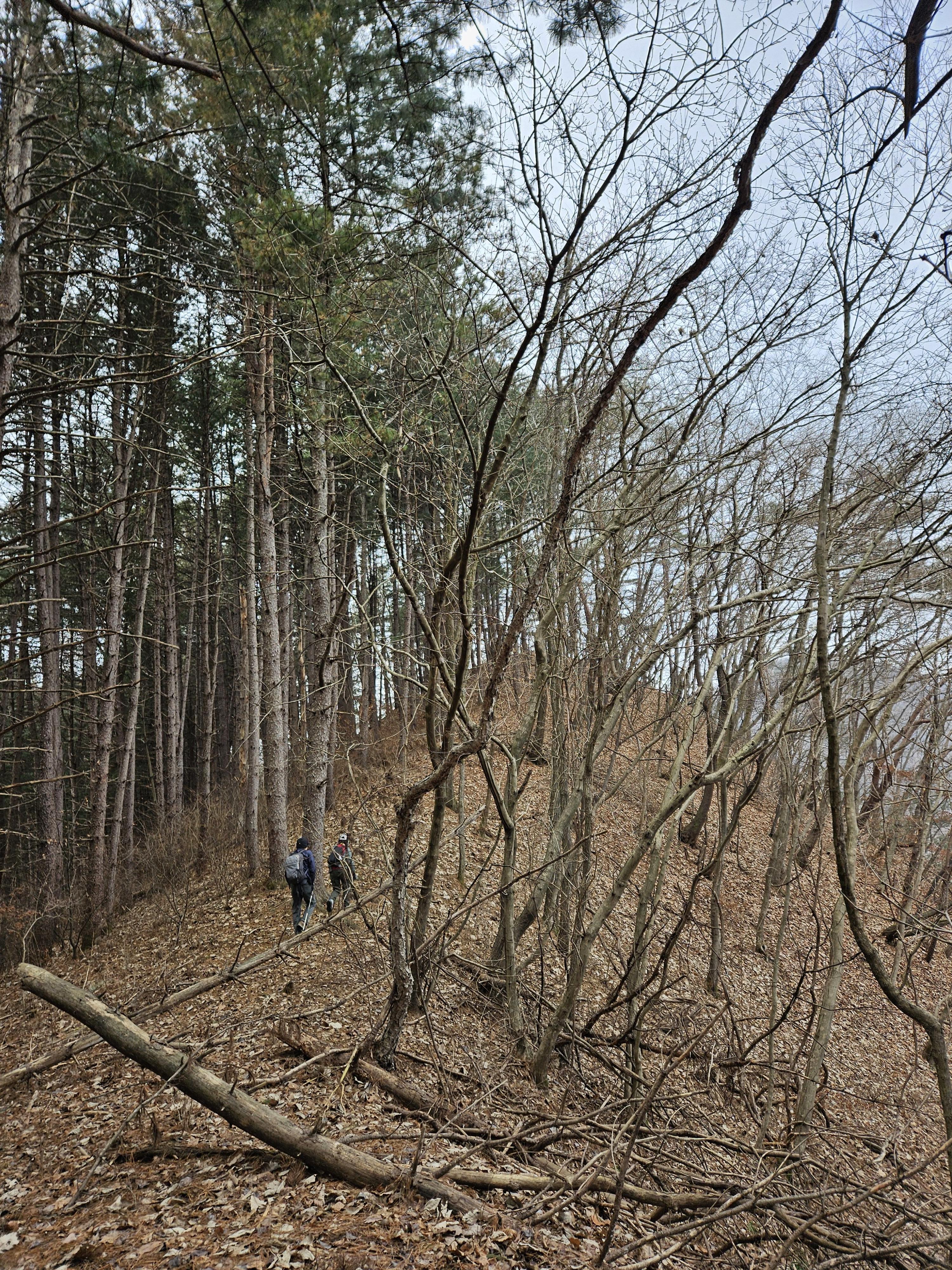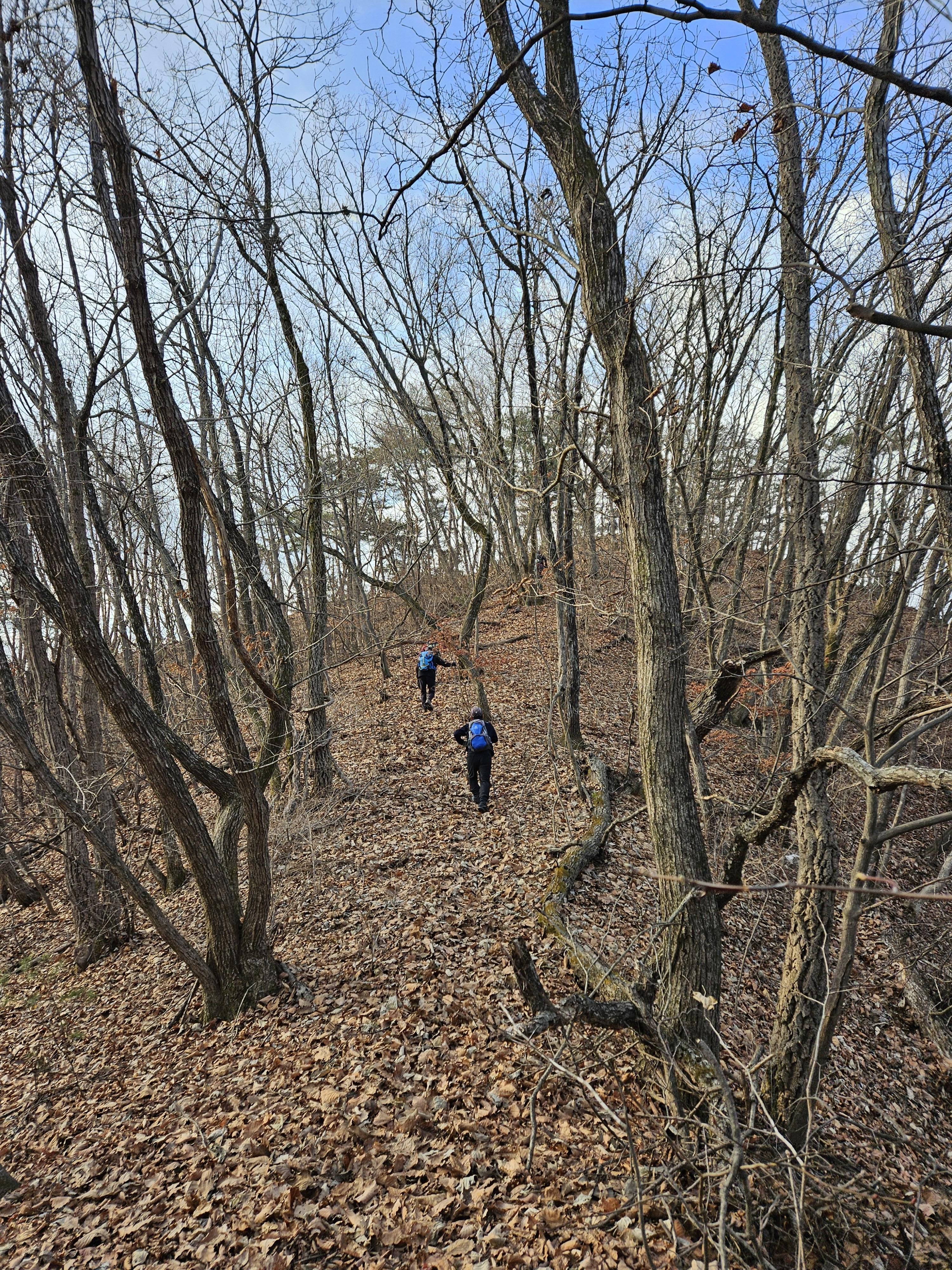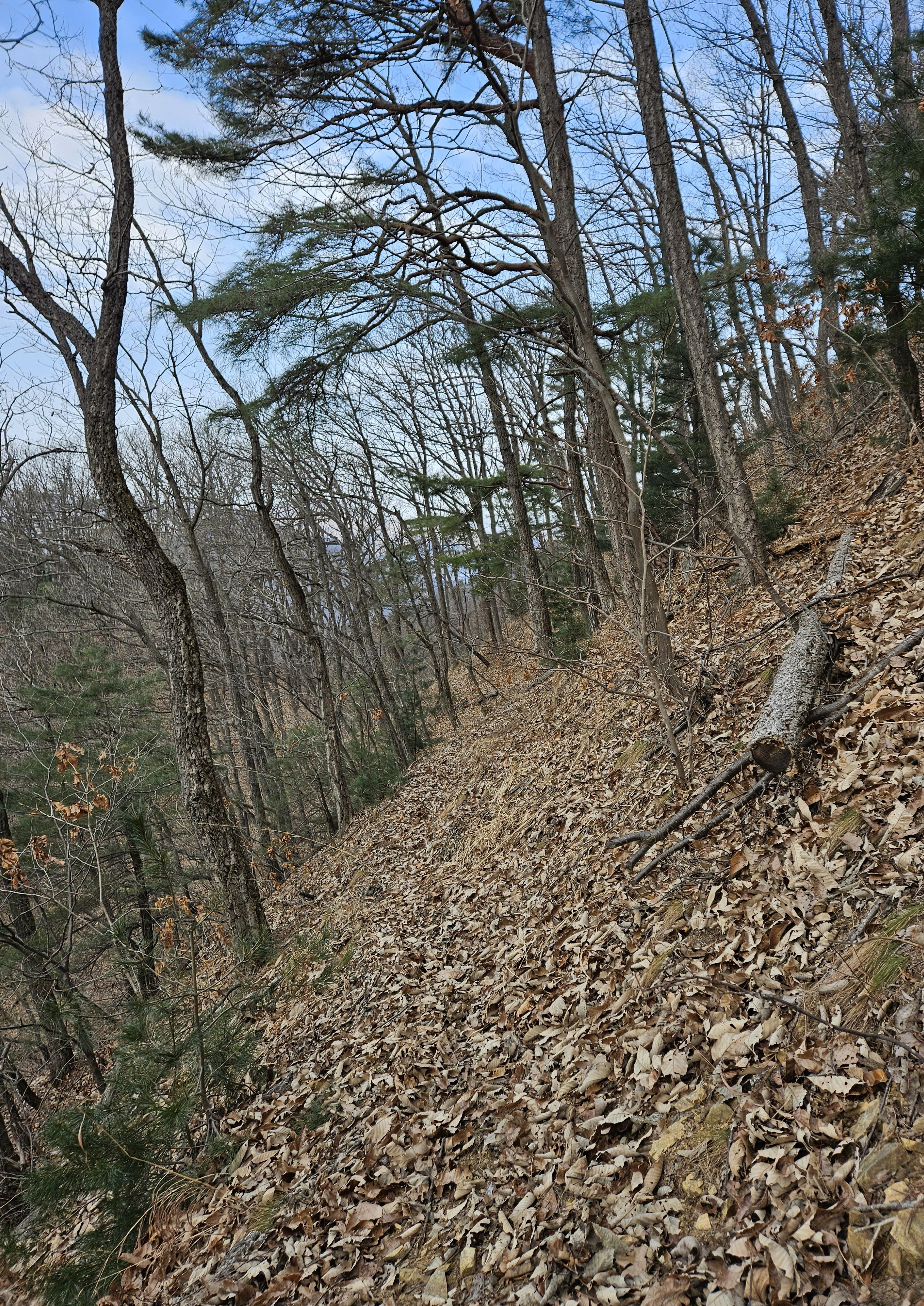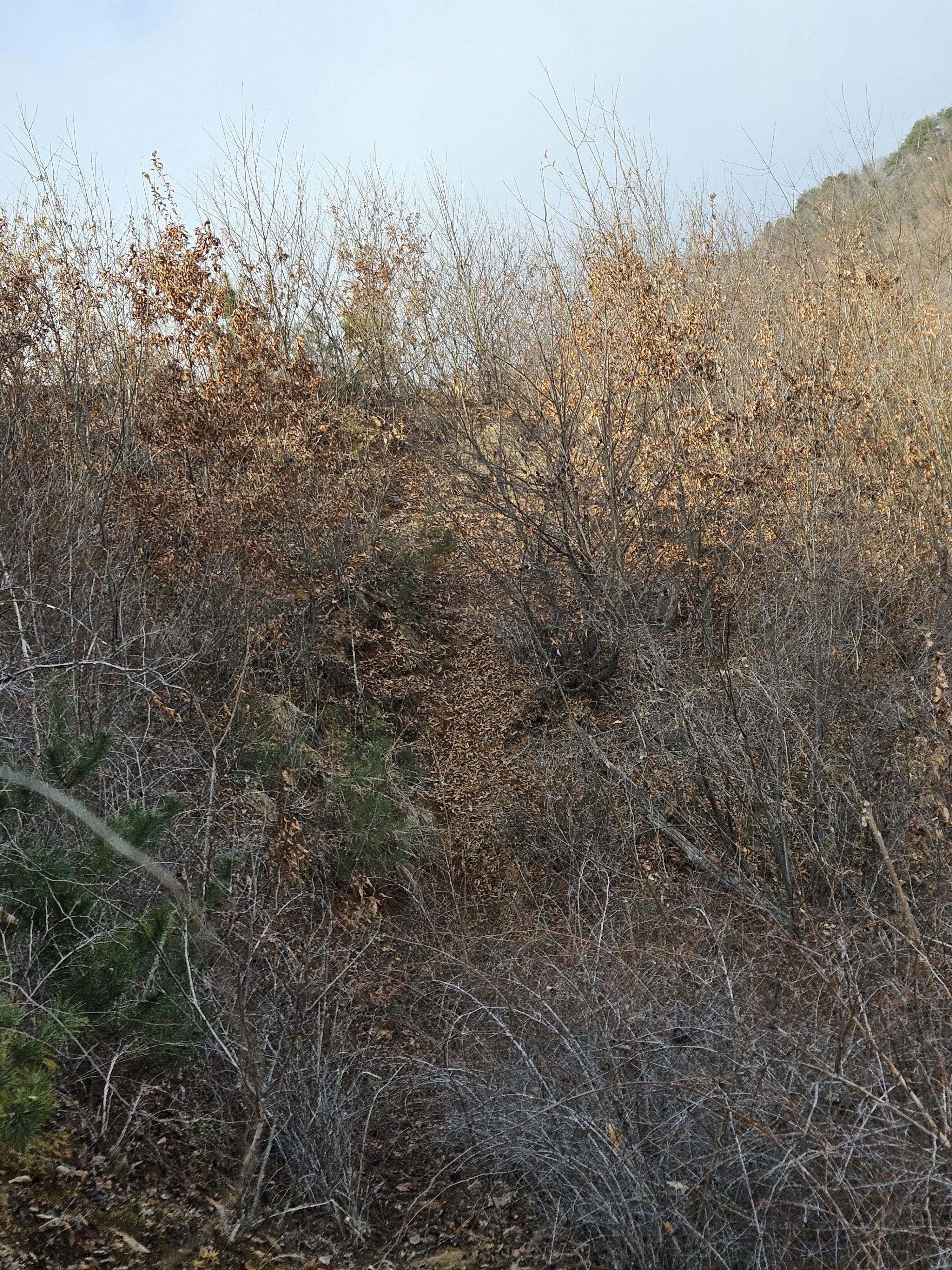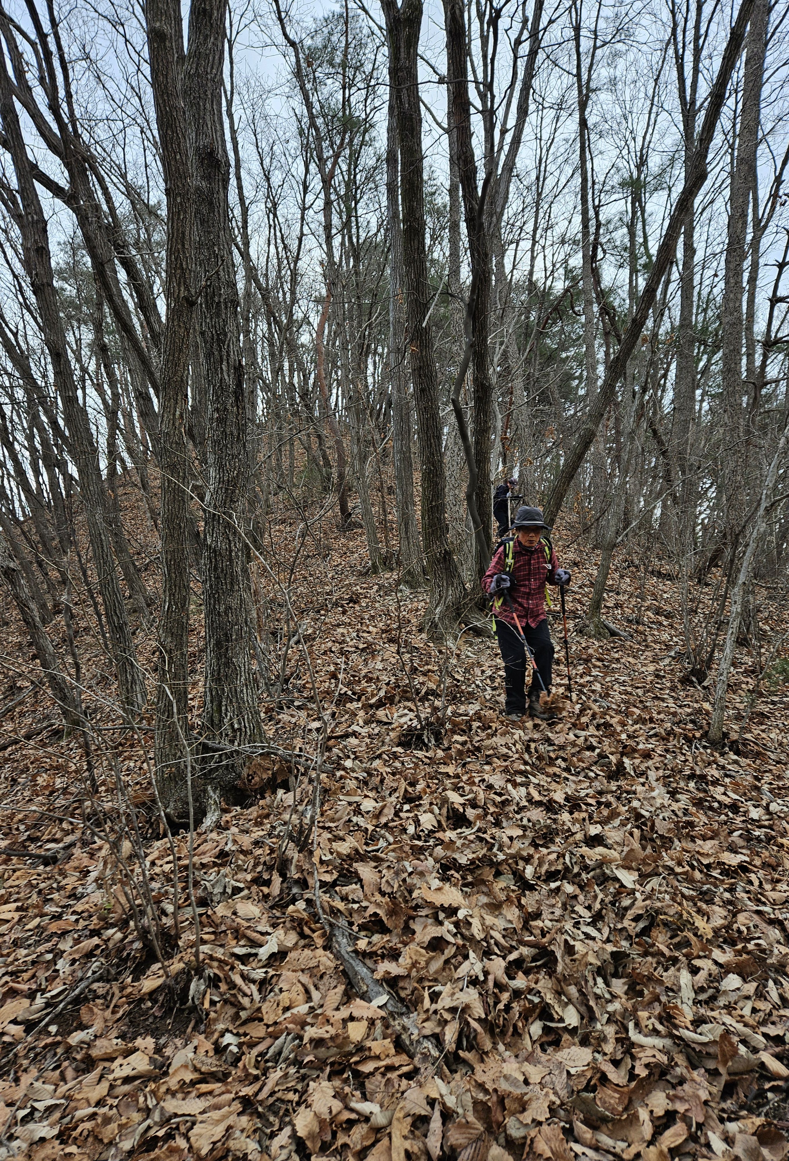 쓰러진 잡목에 쌓인 낙엽에 비스듬한 산허리...혼신의힘 발휘중...