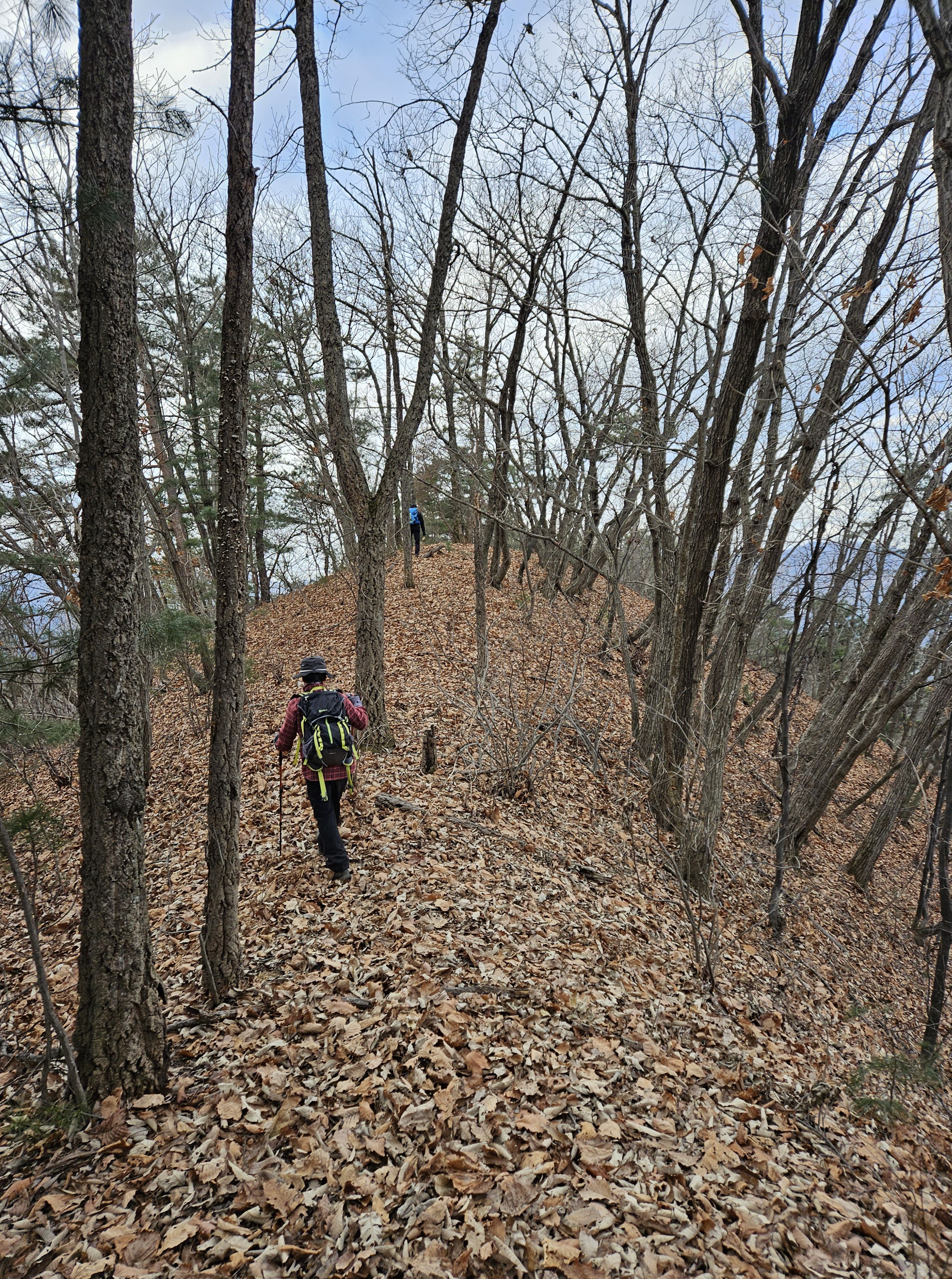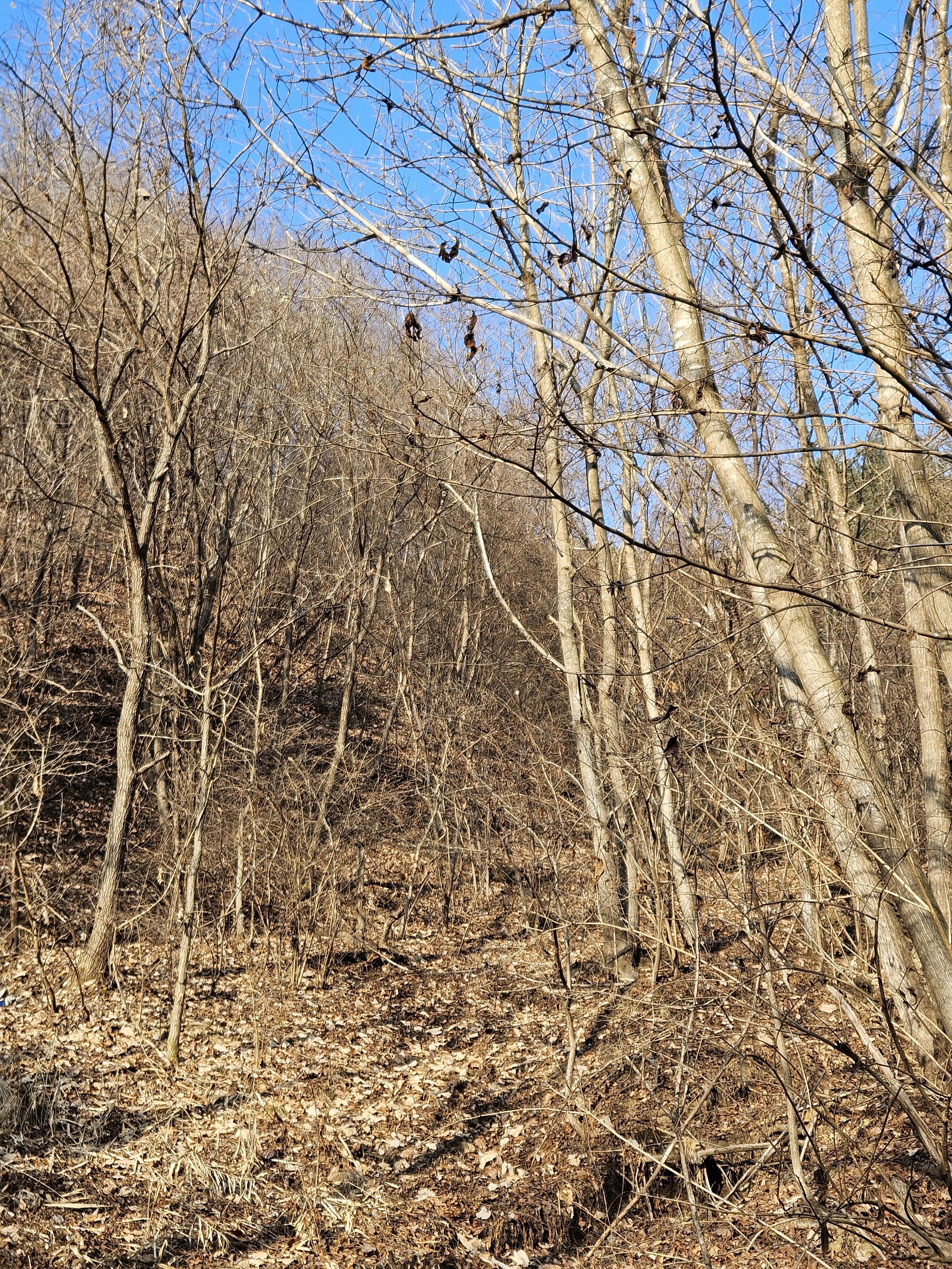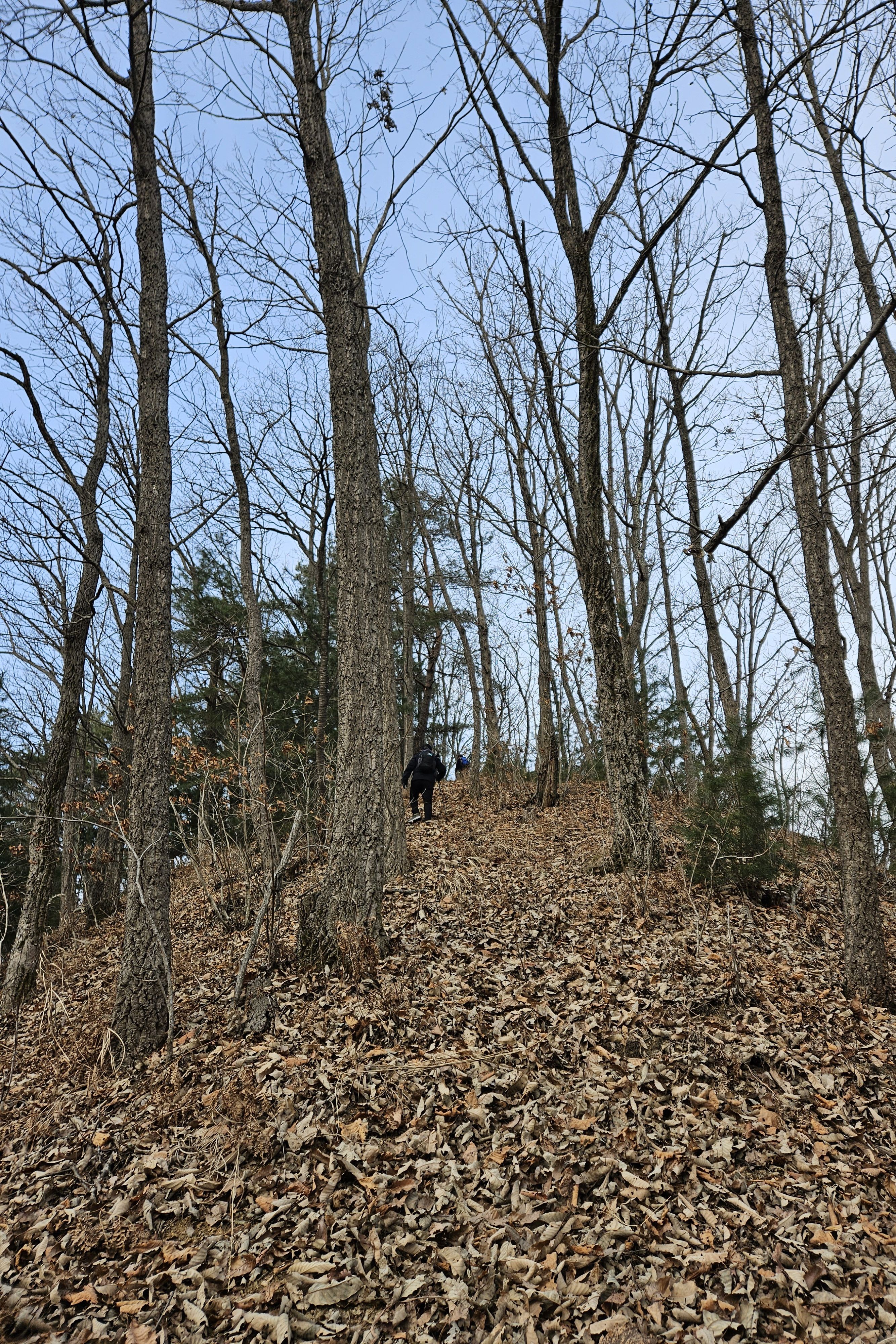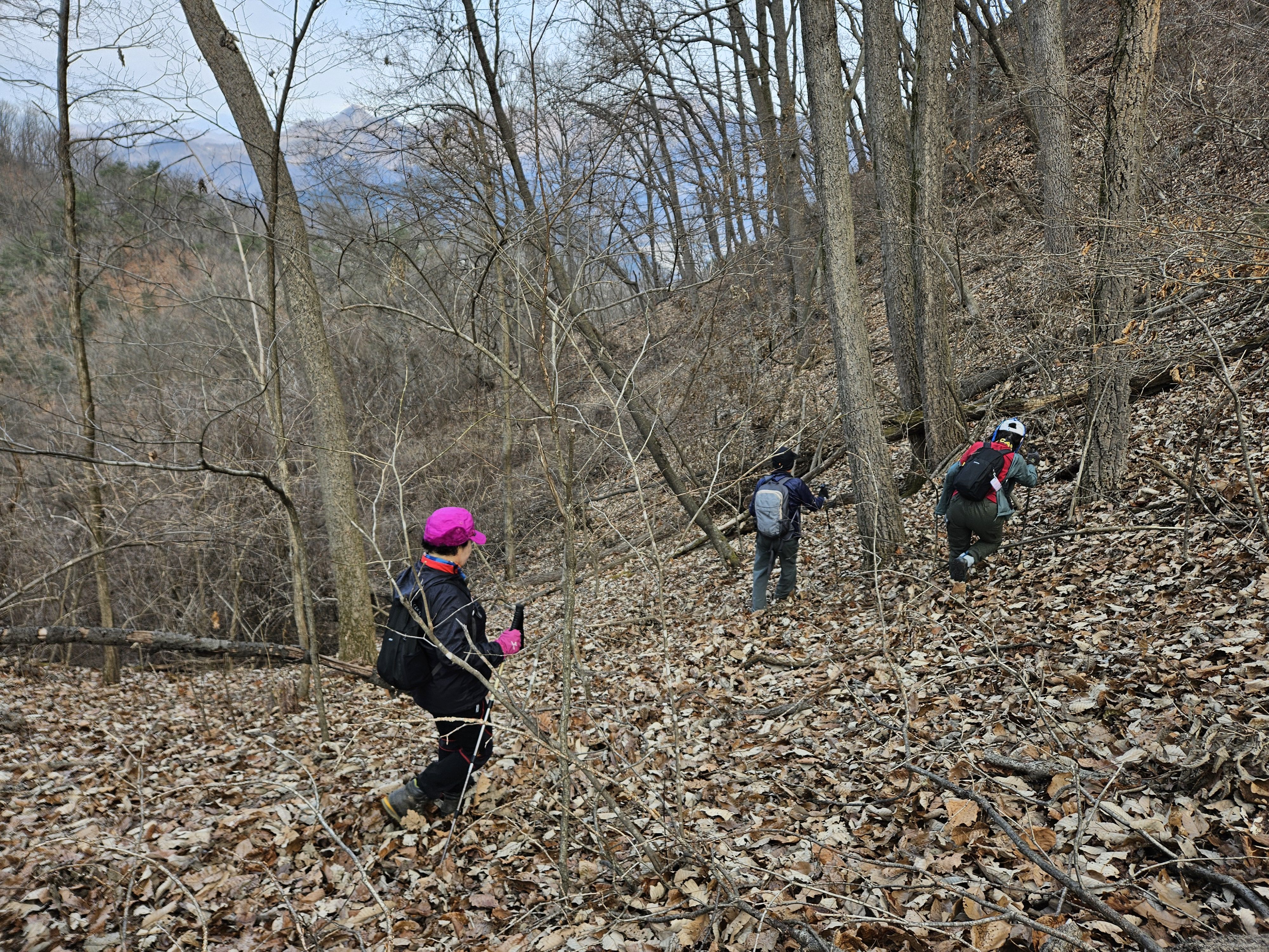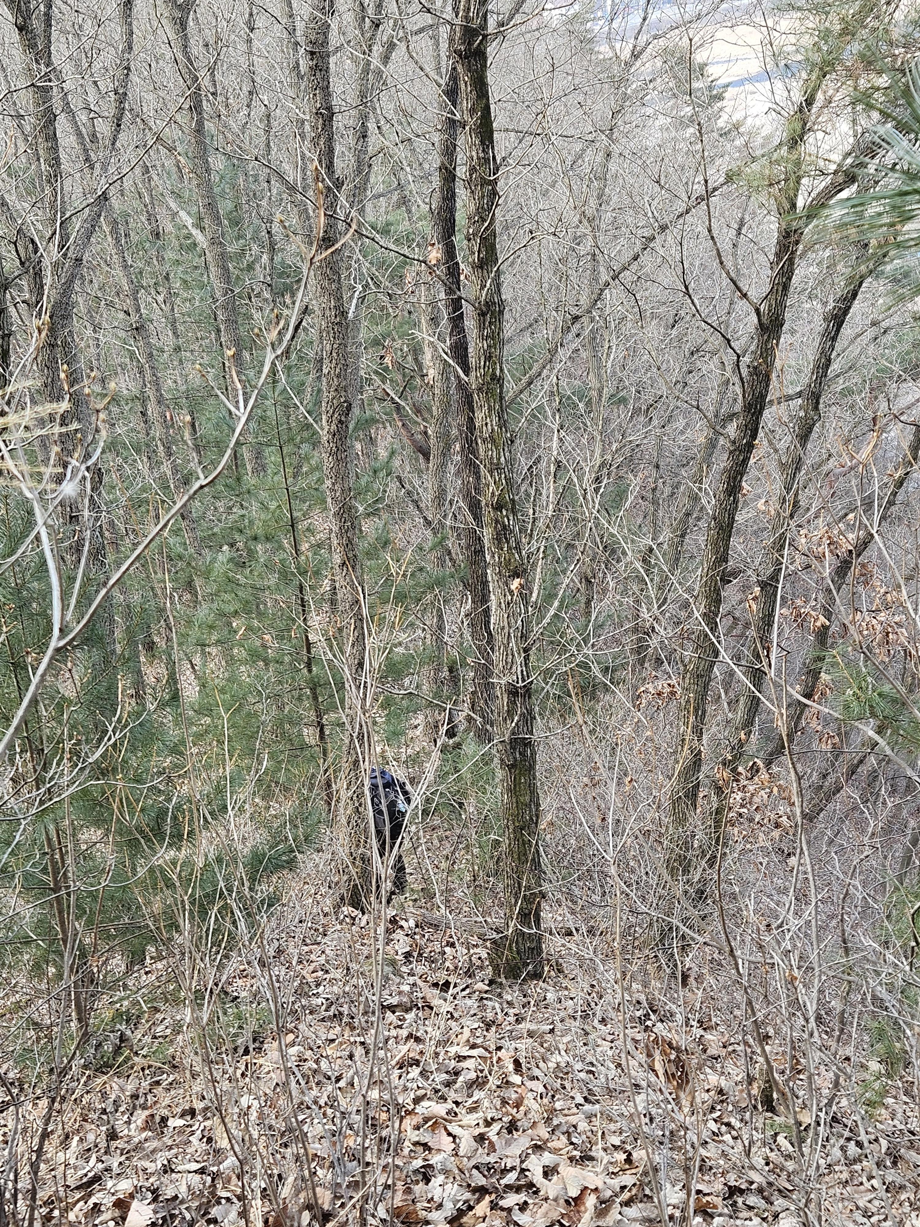 쓰러진 잡목에 쌓인 낙엽에 비스듬한 산허리...혼신의힘 발휘중...