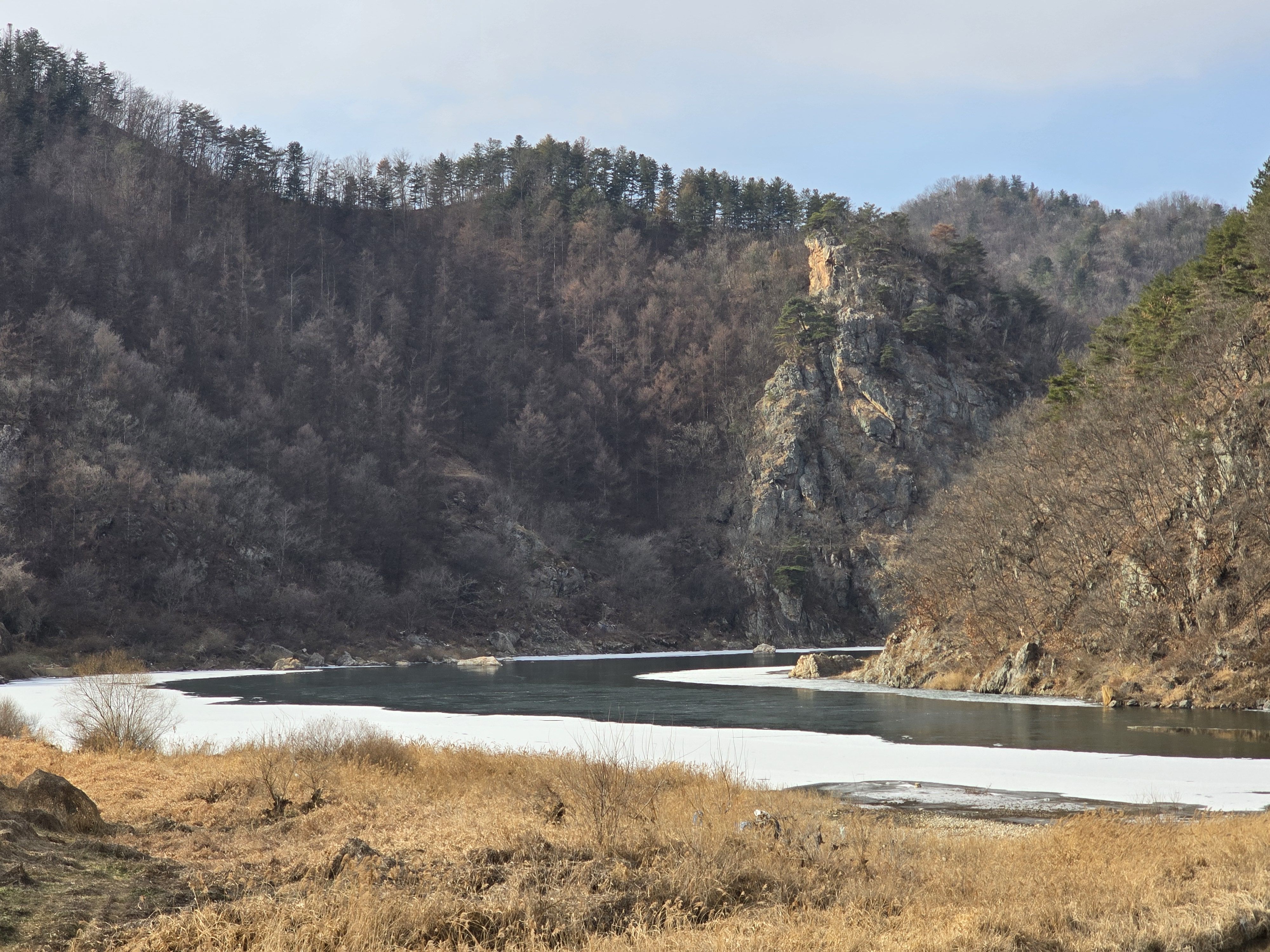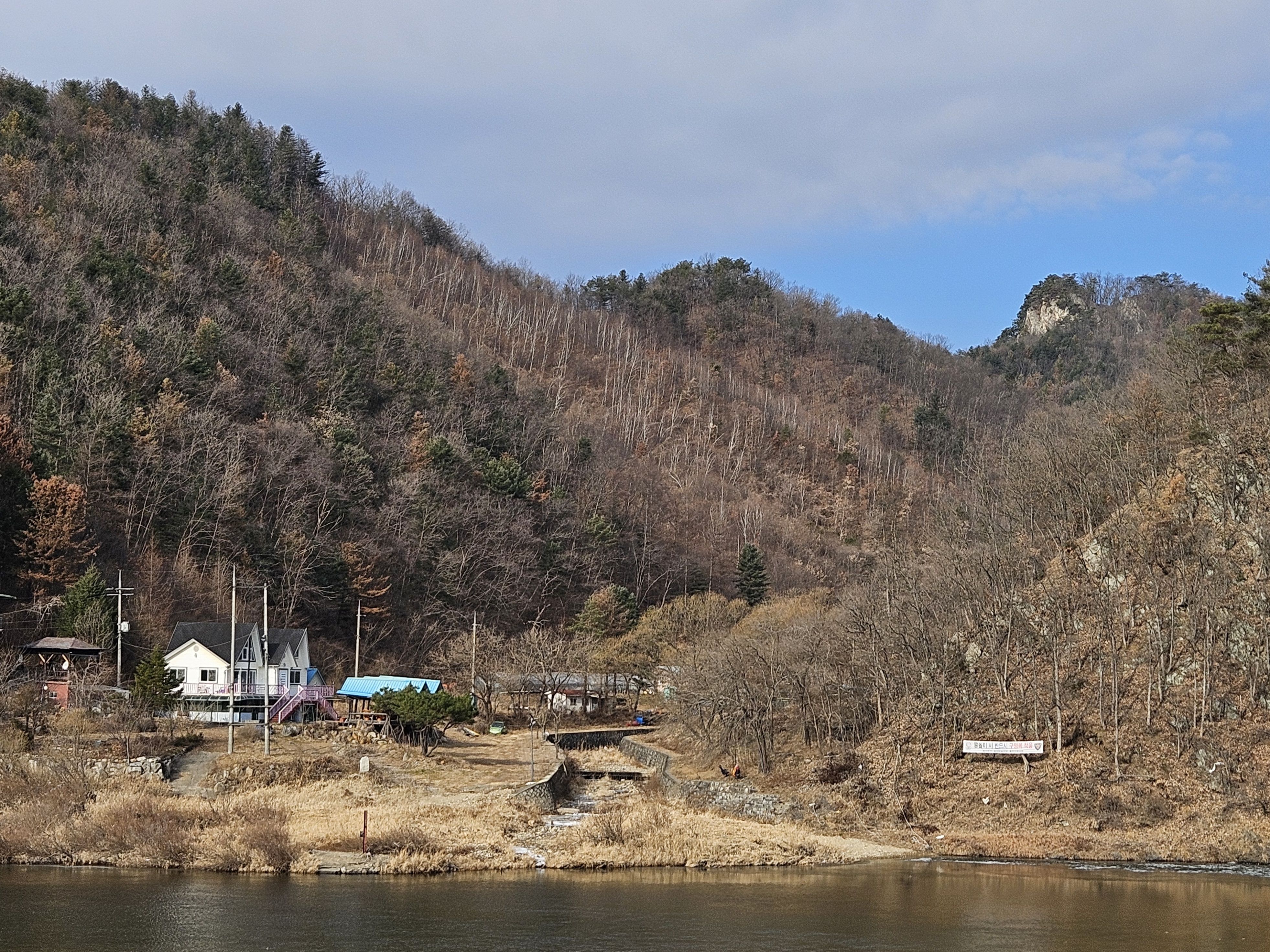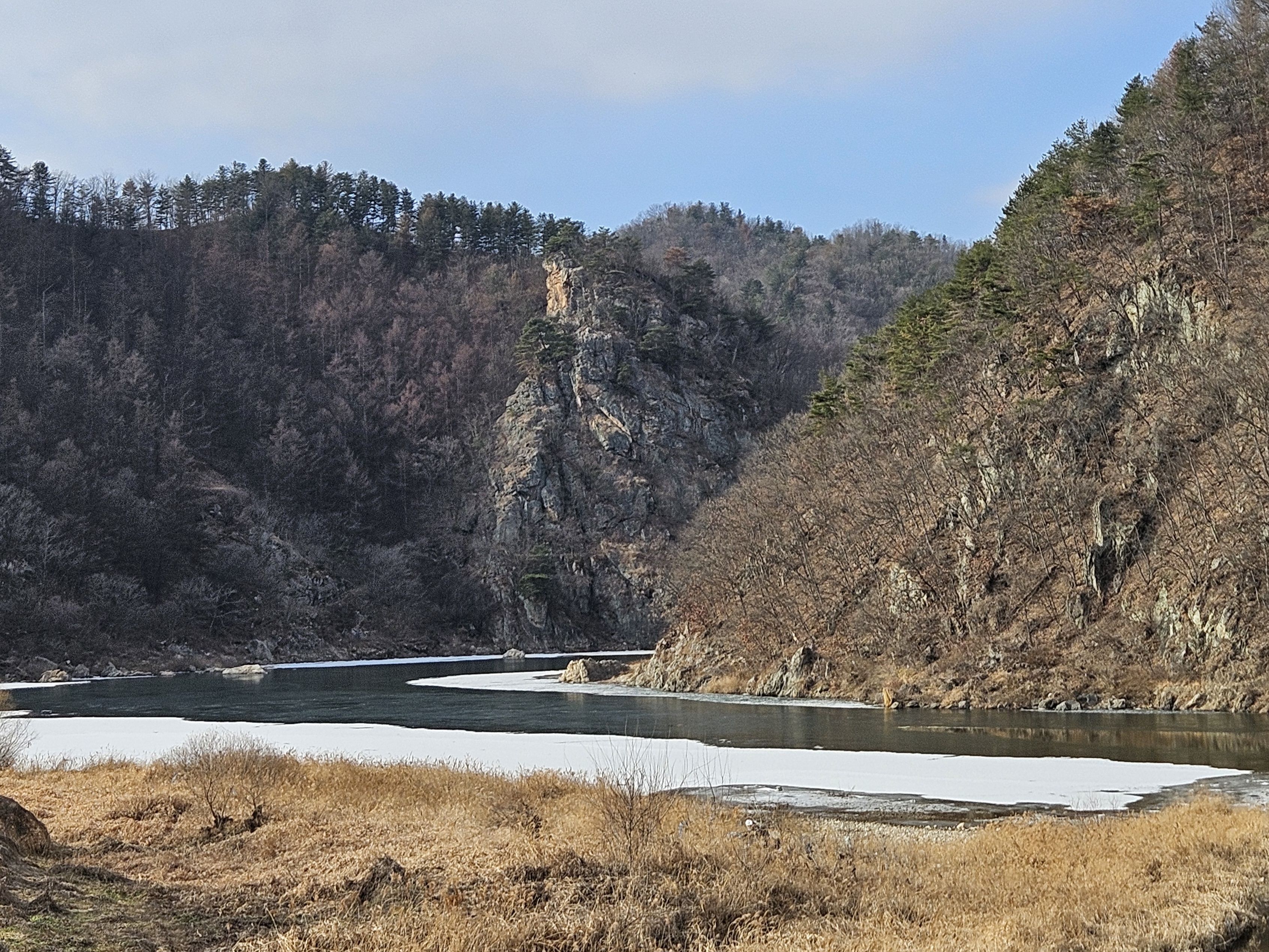 이 지점 선두그룹 먼저 강변길 가셨는데 길이 끊어져 얼음판 밟고 건너다가 얼음판 찌찌직~~위험하다고 산길로 오라는 연락받고 산길 시도 했는데..