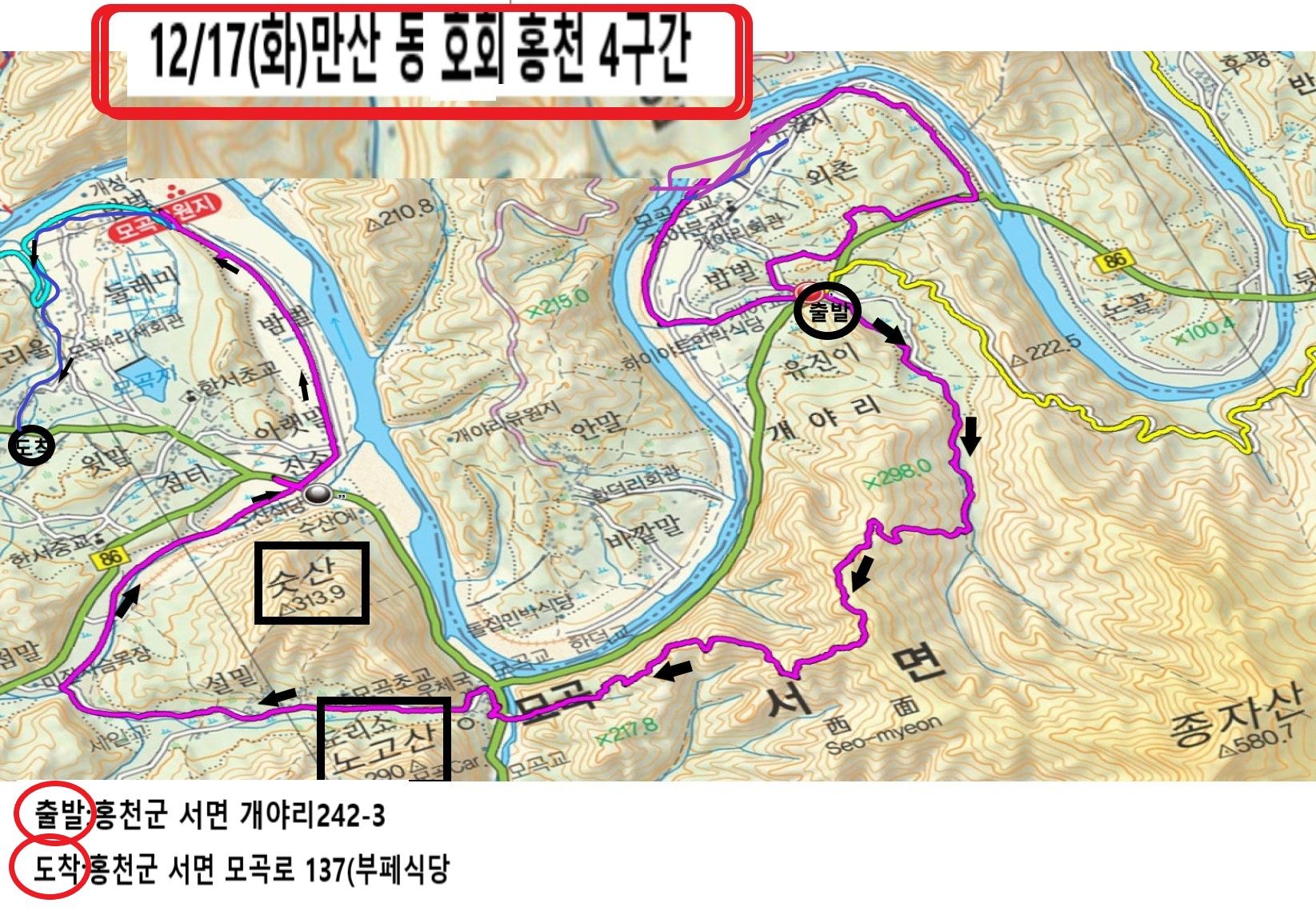 강원도 홍천군 서면 개야리-정암사-천주교 모곡피정의집-모곡초교-모곡밤벌유원지-종점-초원 보리밥뷔페식당