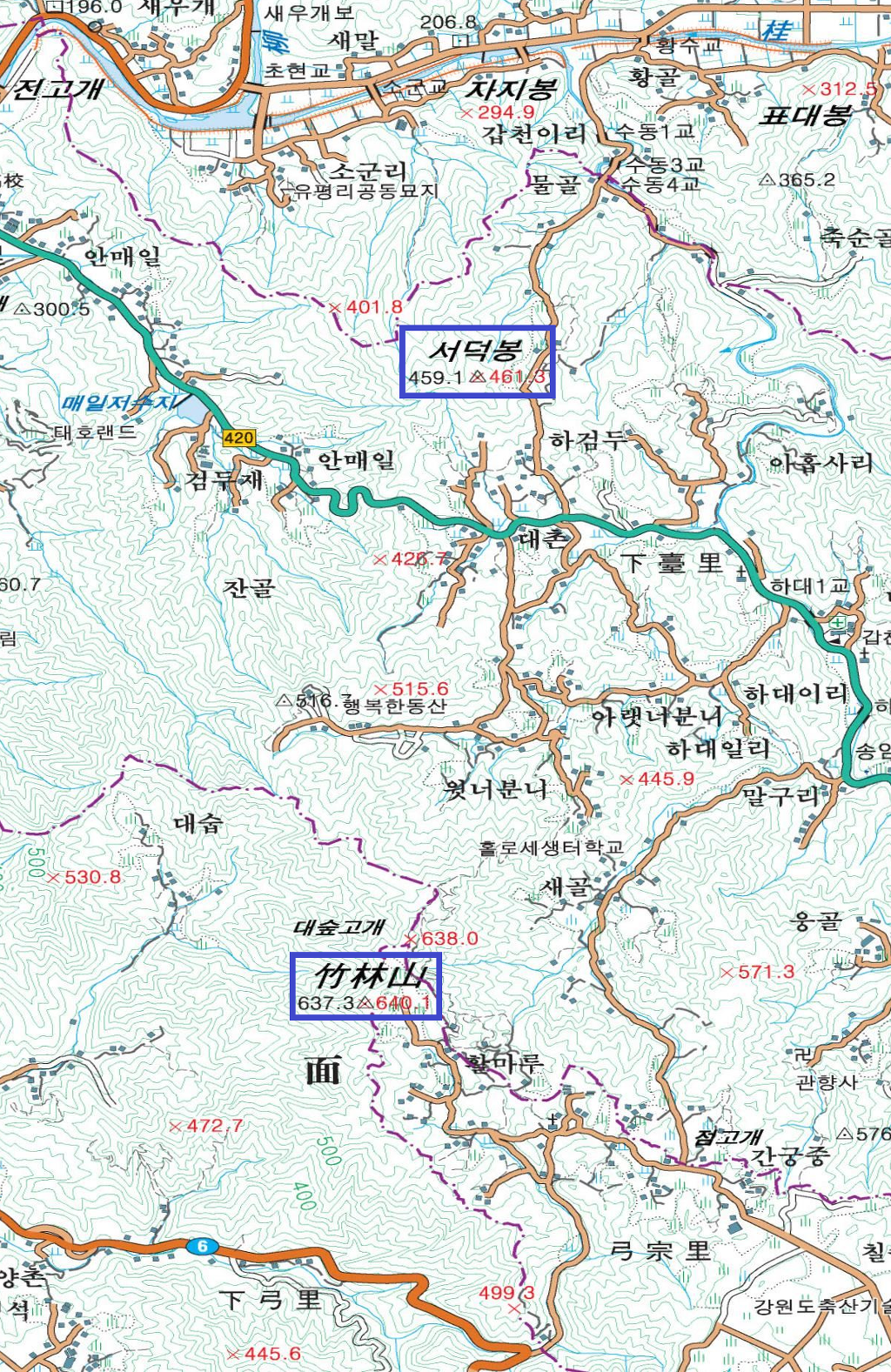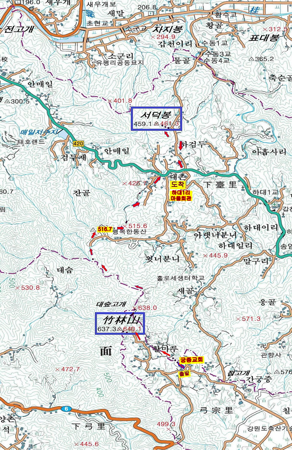 대숲고개~516.7봉(삼각점)-420번도로-서덕봉(▲461.3m)~하대1리 마을회관(330m)
