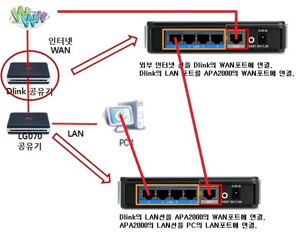 즉 dlink사의 공유기를 맨 앞의 외부에서 들어오는 인터넷을 Wan포트에 연결하고, dlink의 LAN포트에서 LG070공유기의 WAN선으로 연결 합니다.