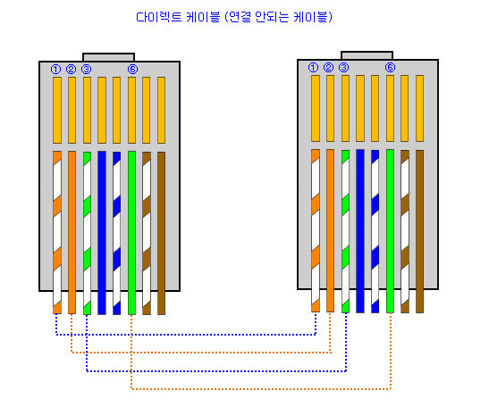 RJ45와 UTP 케이블을 이용해 케이블 찍을 때 사용하는 선 배열.