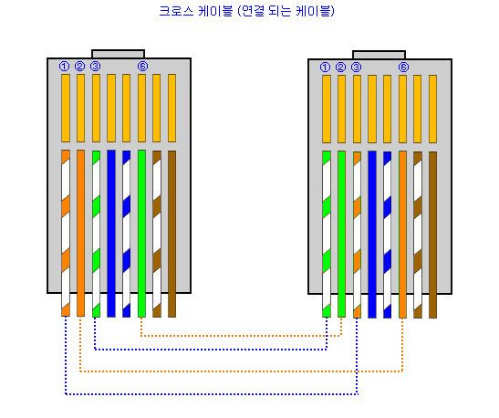 한쪽은 12345678 다른 한쪽은 36145278로 배열함. 1,2번과 3,6번이 서로 바뀜. 장비 대 장비를 연결할 때 사용함. PC끼리 연결하거나 허브기리 연결시 주로 사용. 한쪽 네트워크 카드의 출력 단자의 신호가 다른 쪽 네트워크 카드의 입력 단자로 전달되도록 케이블의 내부 배선을 변경 한 것이다.
