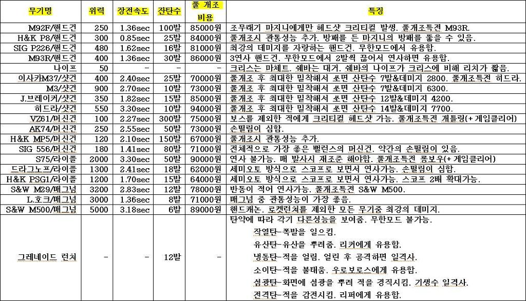 리뷰-머신건은 난사에 매력과 끊어씀으로서 권총대신,샷건처럼 몰려있는 적에게 효과가 있지만,기본적으로 파워가 권총과비슷하기때문에 조준사격을 통한 헤드샷이라면 VZ61이 좋지만,연사의 특성상 크리티컬보단 강한 파워로 헤드샷을 크리티컬없이 죽일수있기때문에 파워가 높은 Ak가 좋다.하지만 Ak는 반동이 심하다는 단점이 있다.