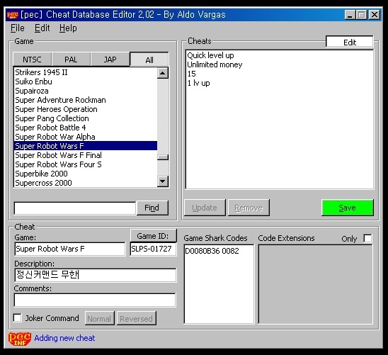그리고 코드명과 코드를 넣어주시고 초록색버튼 세이브 눌러주시면 psx emulation cheater