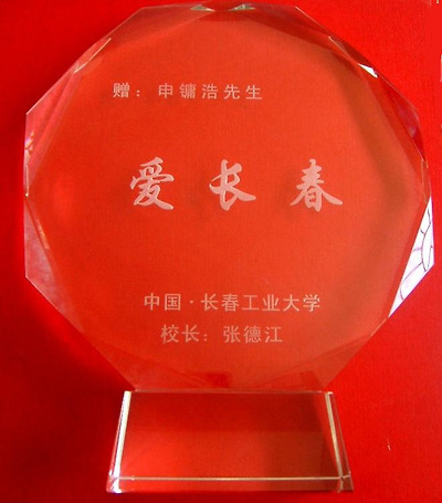 쥔장님께 보내 온 장춘공업대학의 감사패