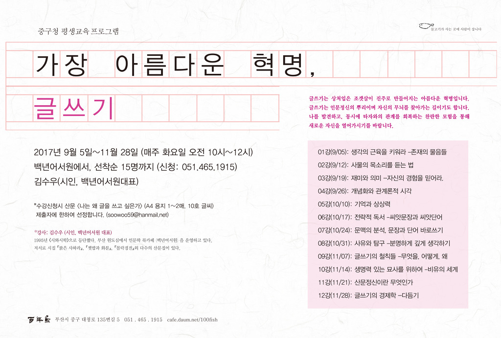중구청 평생교육프로그램 <가장 아름다운 혁명, 글쓰기> 2017년 9월 5일부터 매주 화요일 오전 10시, 김수우 시인 작성자김수우|작성시간17.07.05|조회수236 목록 댓글 0 글자크기 작게가 글자크기 크게가 다음검색 현재 게시글 추가 기능 열기 북마크 신고 센터로 신고 댓글 댓글 0 댓글쓰기 답글쓰기 댓글 리스트