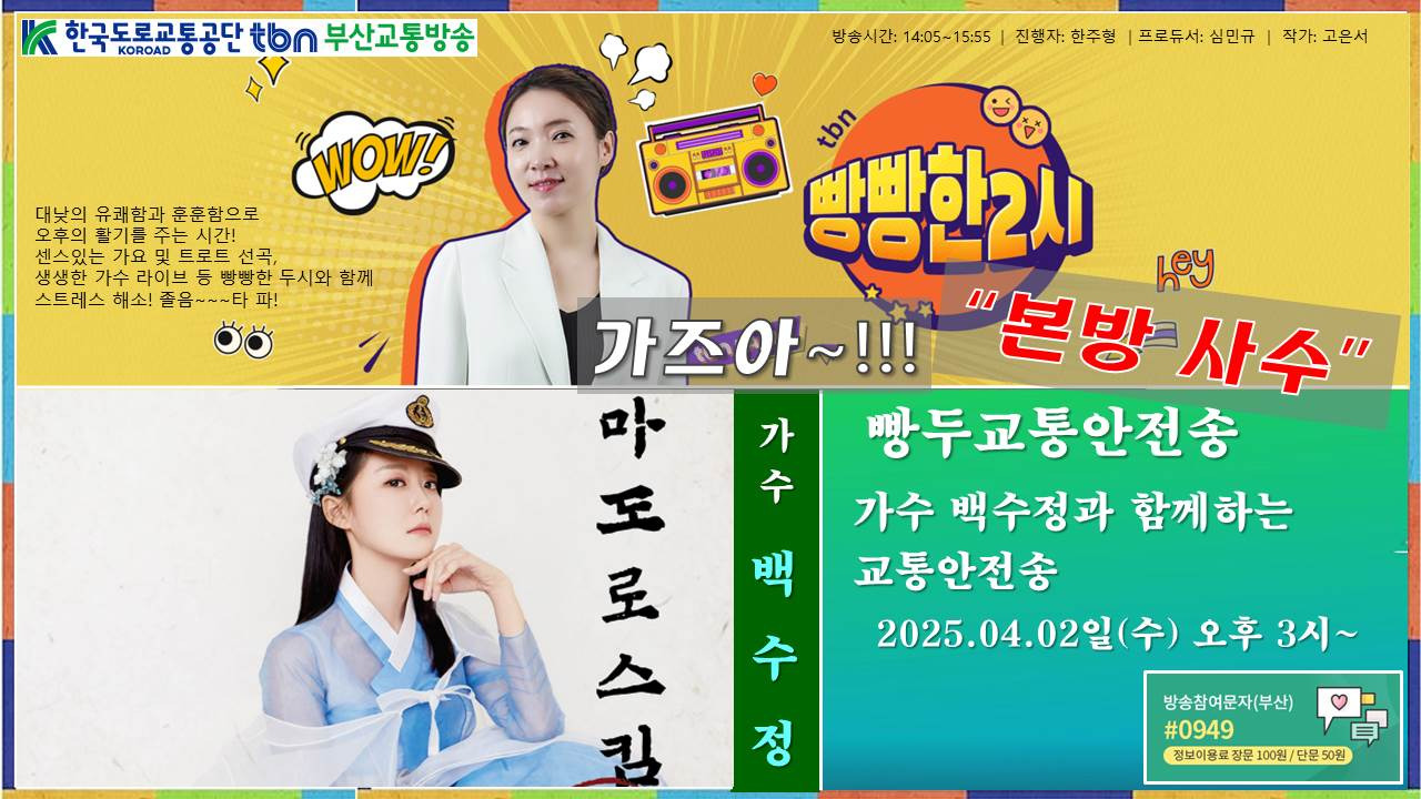 매주 수요일 오후3시 부산교통방송 빵빵한2시 백수정 가수 출연 작성자상식있당(수정삼촌)^^|작성시간25.04.11|조회수1 목록 댓글 0 글자크기 작게가 글자크기 크게가 다음검색 현재 게시글 추가 기능 열기 북마크 공유하기 신고 센터로 신고 댓글 댓글 0 댓글쓰기 댓글 리스트