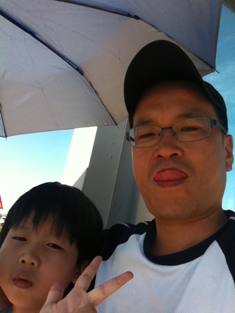 (햇빛이 뜨거워 사진찍을때 인상을 쓰고 있는 정재원어린이....오늘도 날씨가 겁나게 덥다고 하는데..잘 참고 목포까지..)